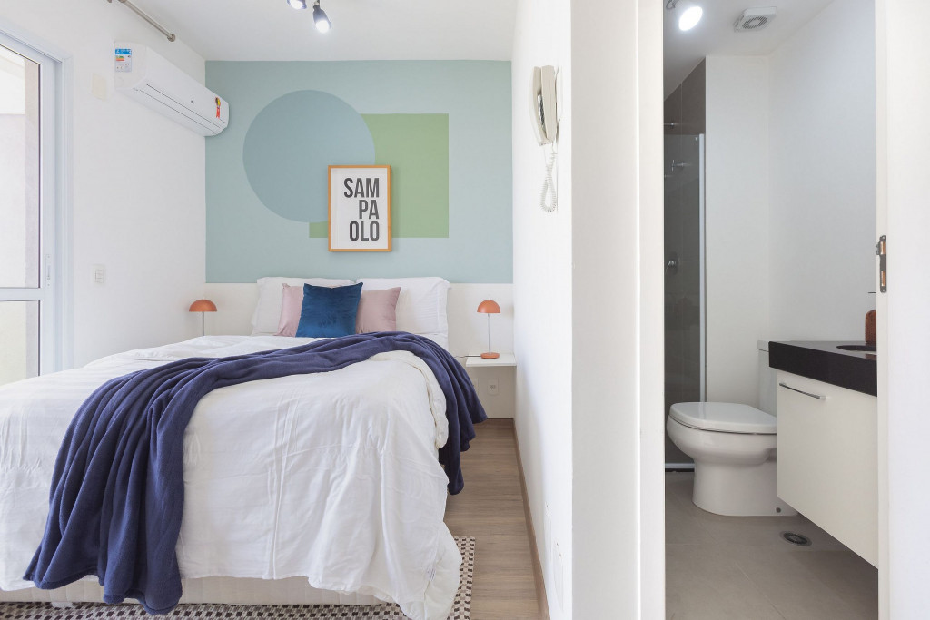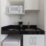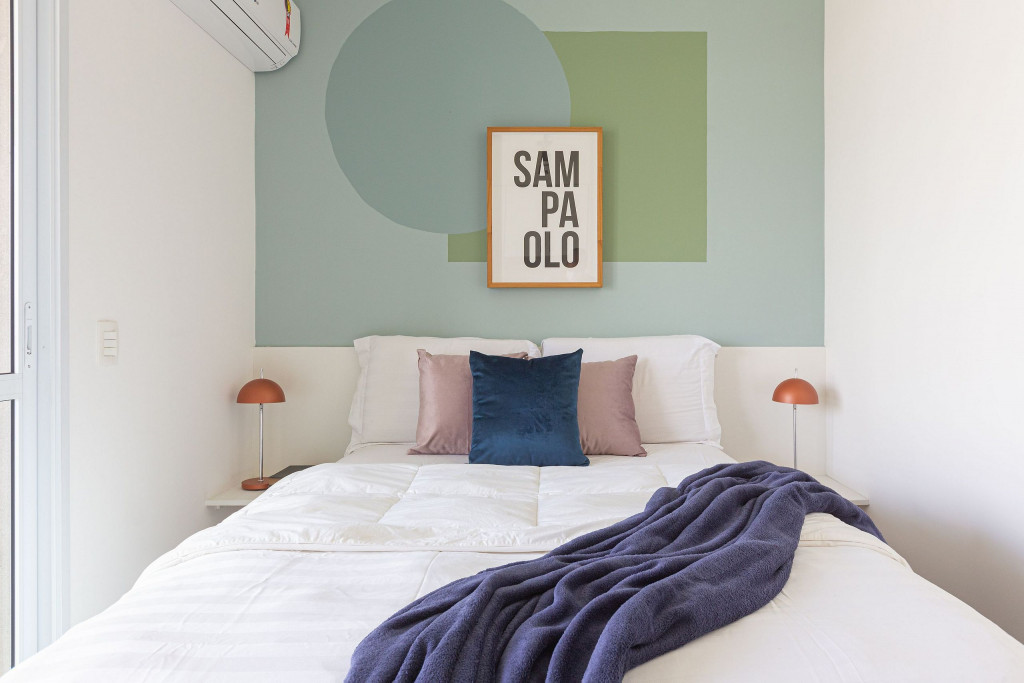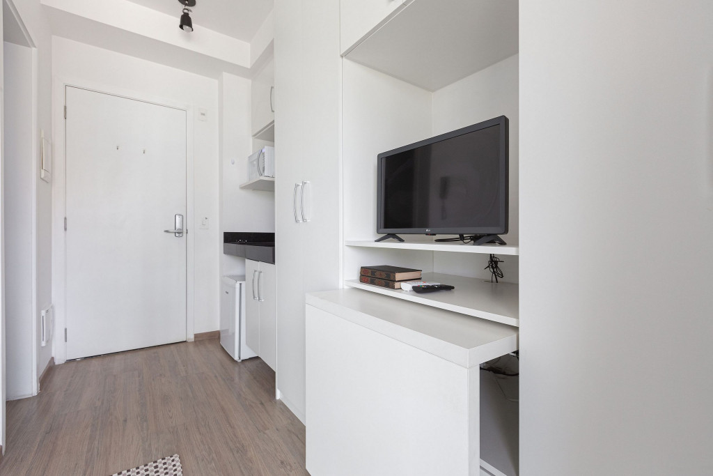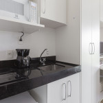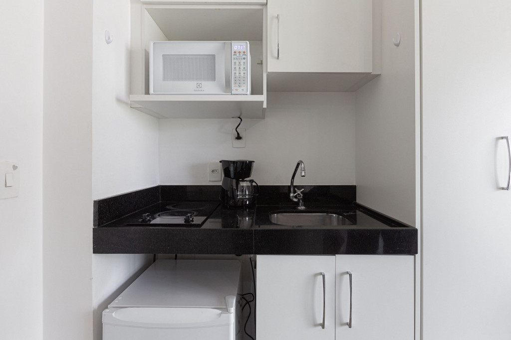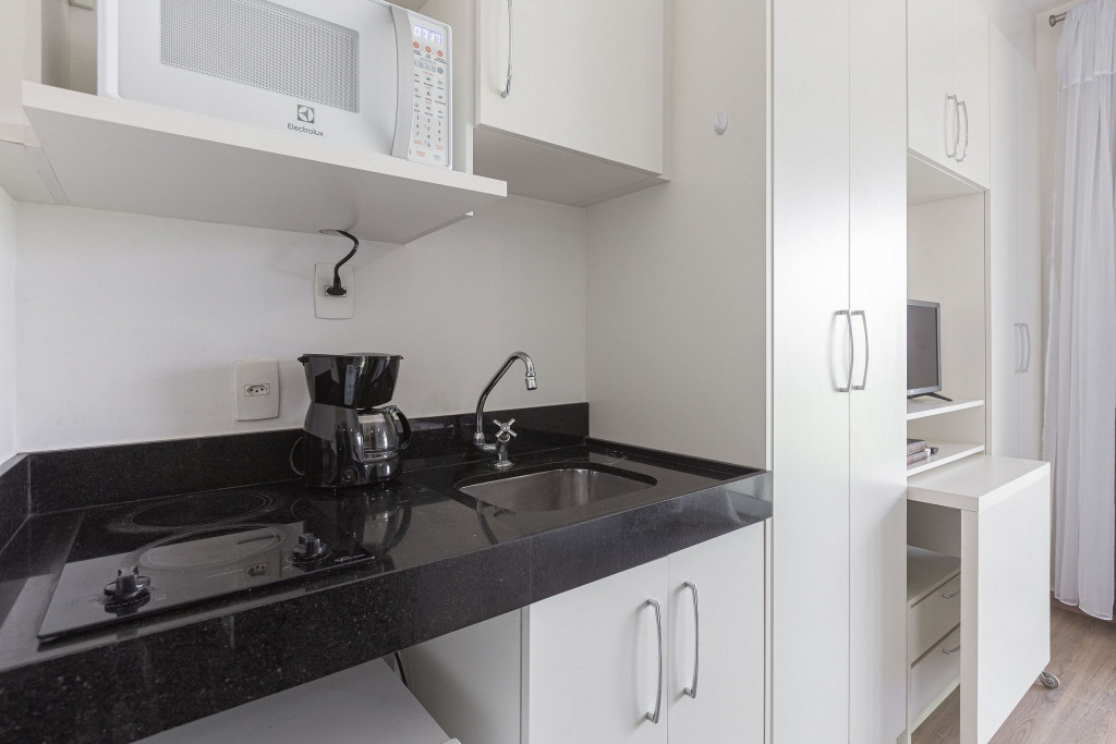 Acomodação completa para sua estadia, o espaço é moderno, bem aproveitado e decorado nas cores verde e branco com pias em mármore preto para você se hospedar com conforto e elegância na rua Turiassú ao lado do Allianz Parque, com frigobar, fogão por indução, microondas, utensílios de cozinha, ar-condicionado, cama queen-size, wi-fi e televisão.