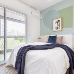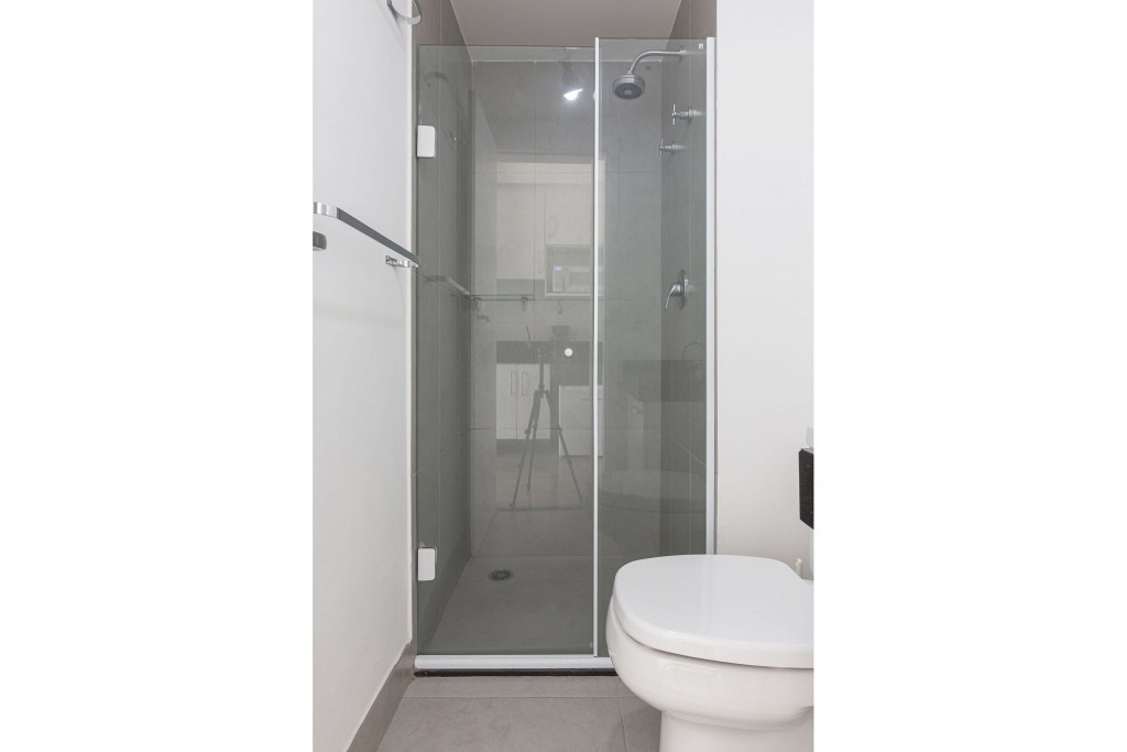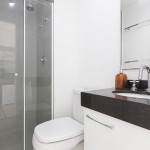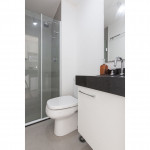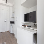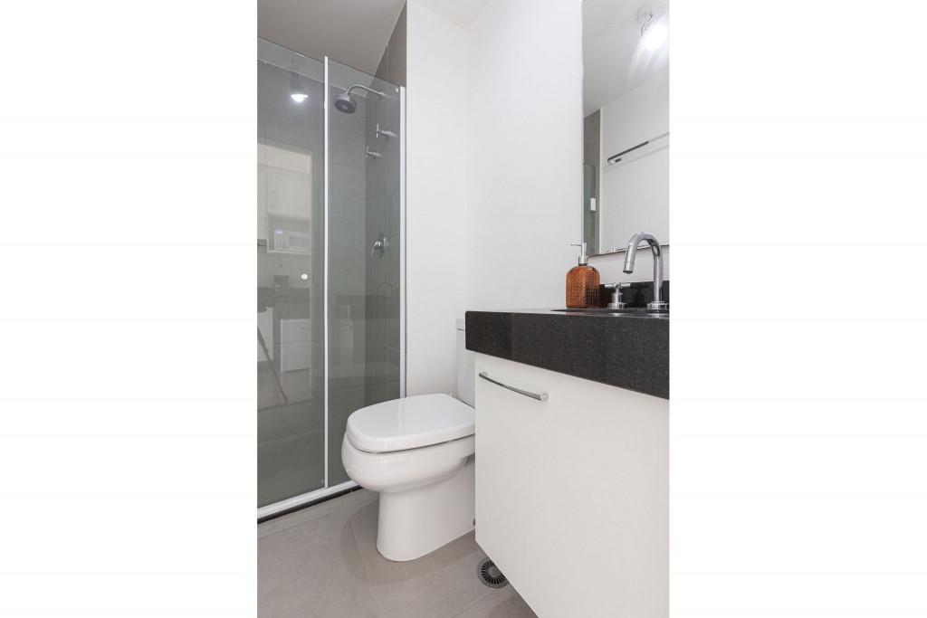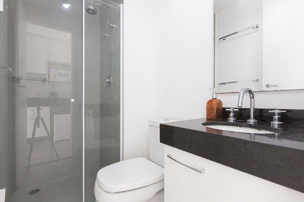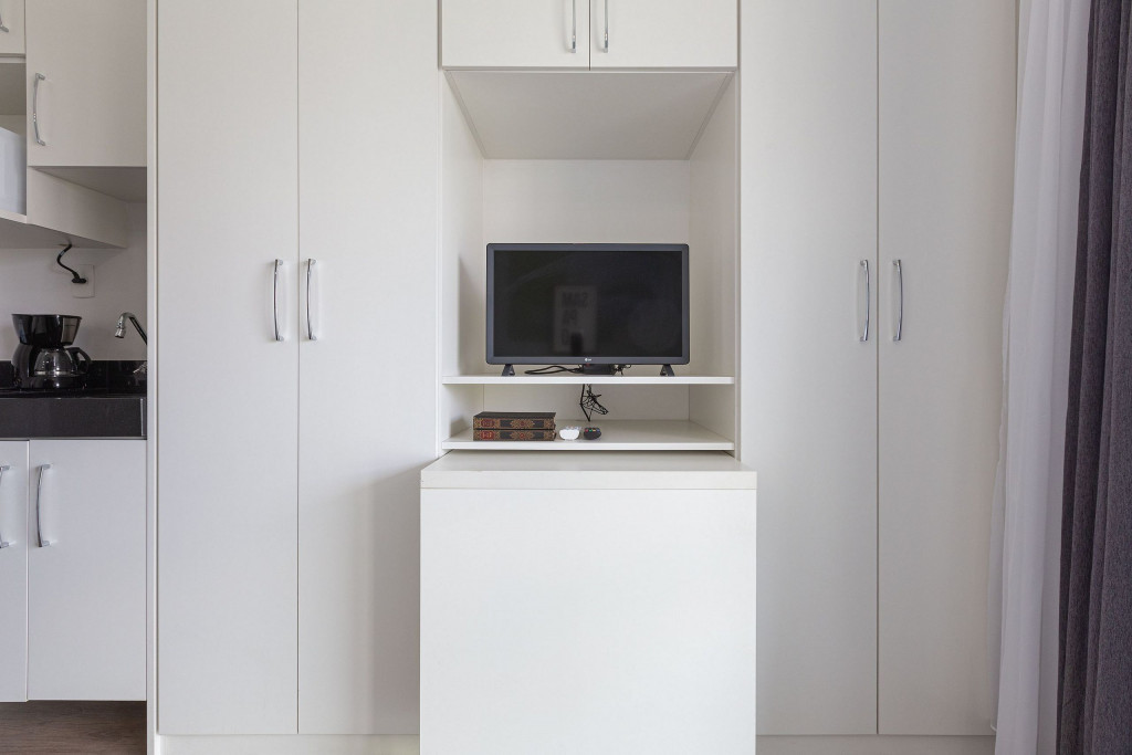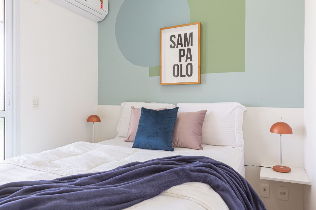 Acomodação completa para sua estadia, o espaço é moderno, bem aproveitado e decorado nas cores verde e branco com pias em mármore preto para você se hospedar com conforto e elegância na rua Turiassú ao lado do Allianz Parque, com frigobar, fogão por indução, microondas, utensílios de cozinha, ar-condicionado, cama queen-size, wi-fi e televisão.