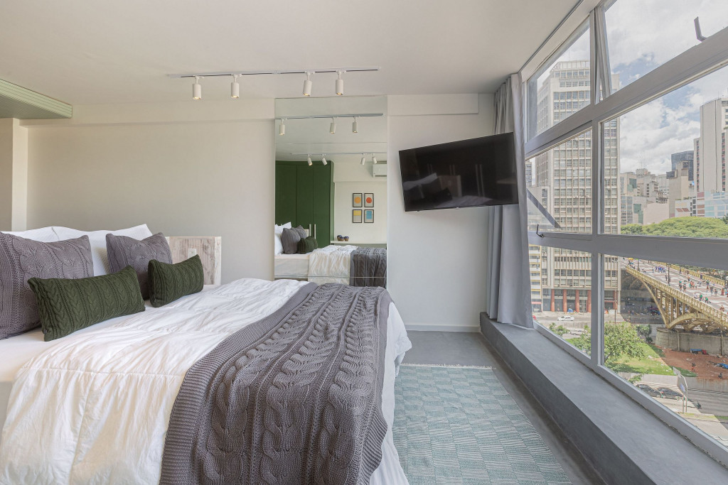 Recém reformado e com uma incrível vista do janelão icônico do 10º andar de um dos Edifícios mais altos da cidade, o estúdio localizado no Mirante do Vale, é palco pro lindo viaduto Santa Ifigênia.A reforma e decoração é um capítulo à parte: o projeto é assinado pelo Renato Mendonça que utilizando materiais finos em todos os ambientes, os integrou de forma harmônica e otimizada, de forma que o torna espaçoso e cheio de personalidade.