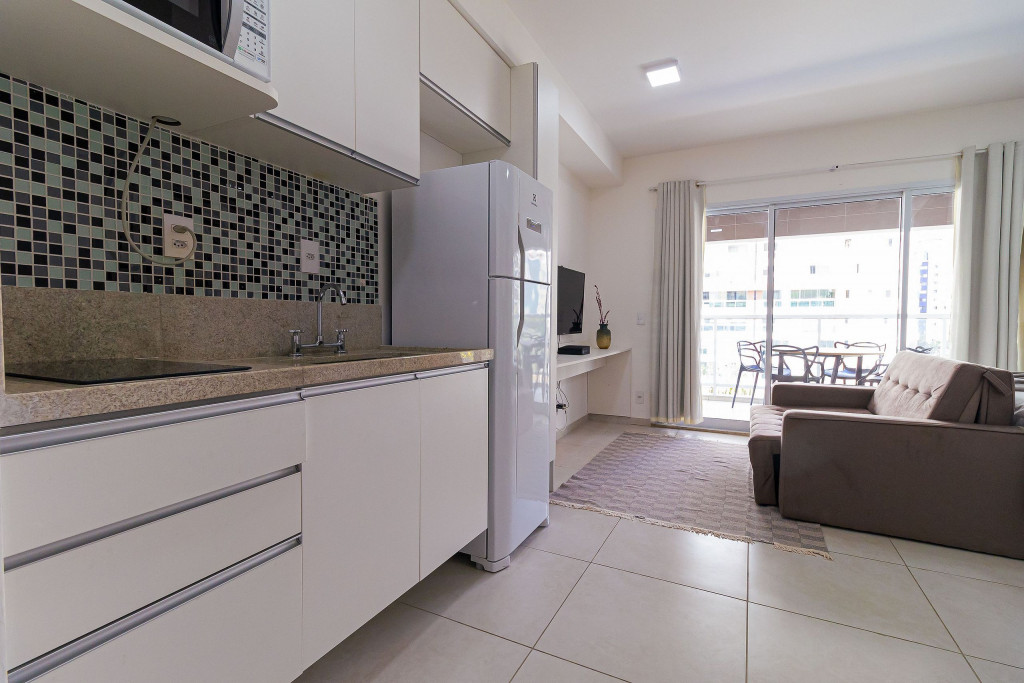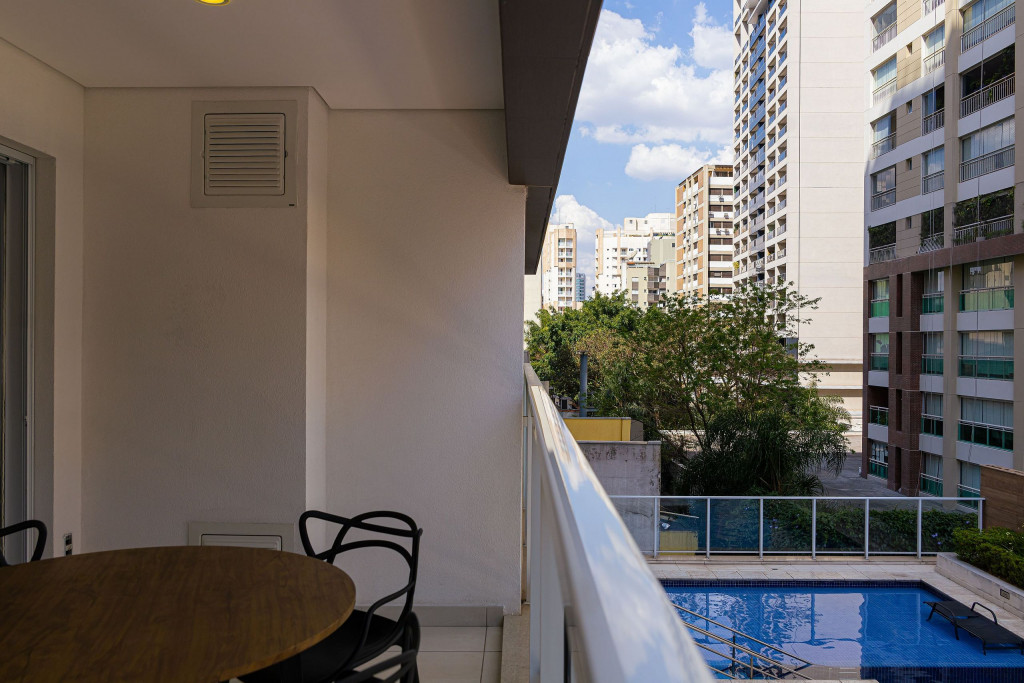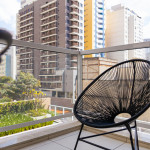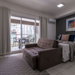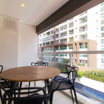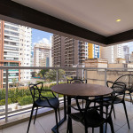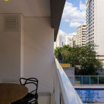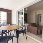 Apartamento confortável, amplo e bem iluminado. Em sua varanda há uma área de para jantar.