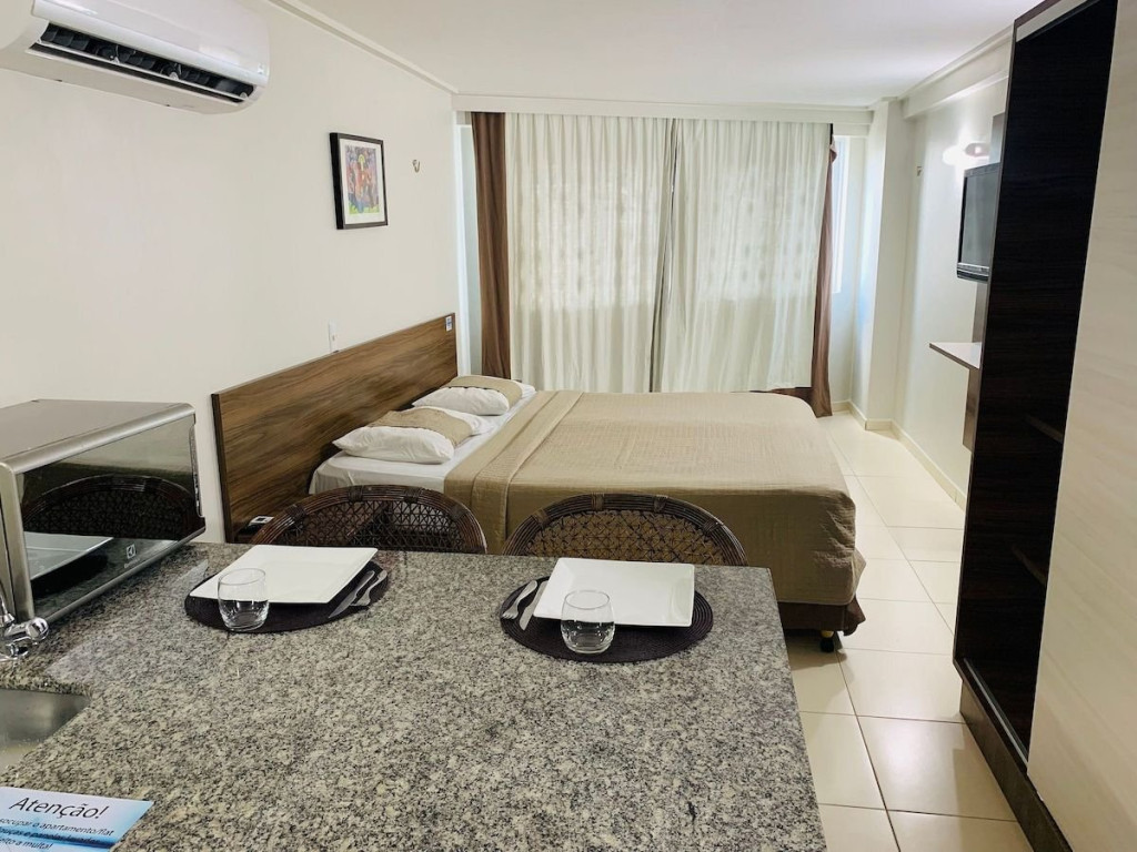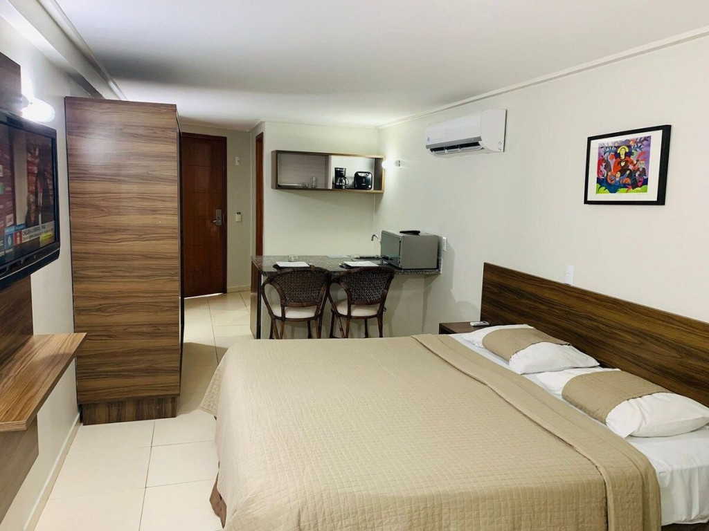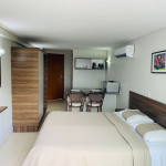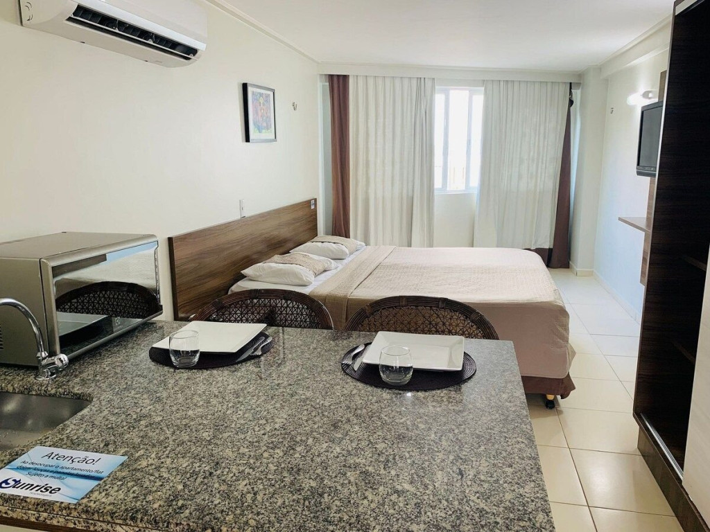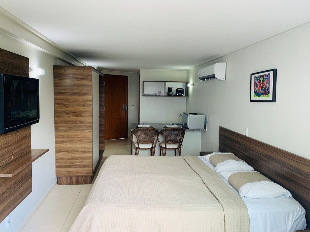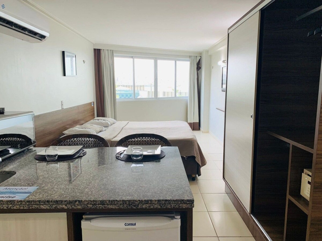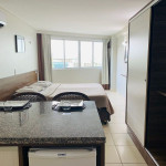 O quarto fica localizado no flat Blue Sunset e possui todos os ambientes integrados. Quarto, balcão de apoio com pia e frigobar e banheiro completo.
