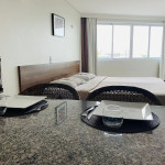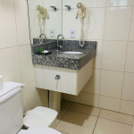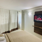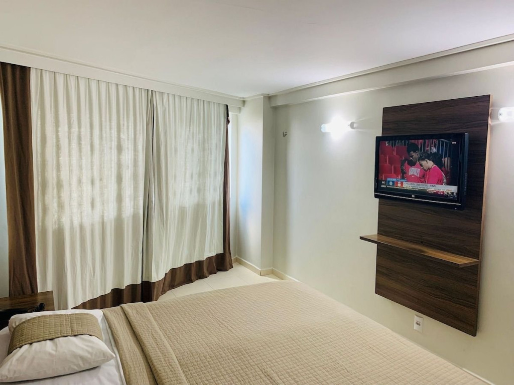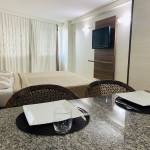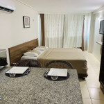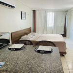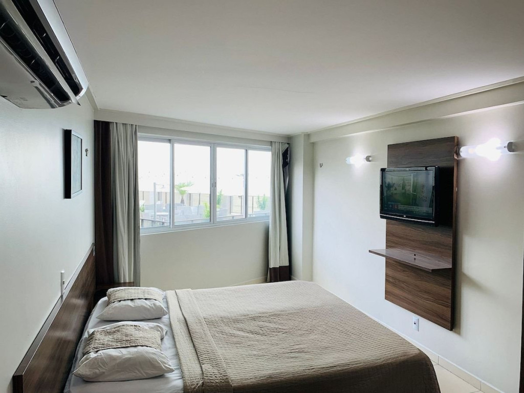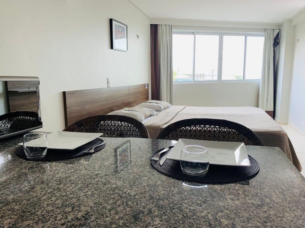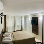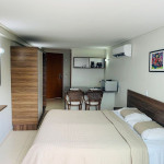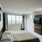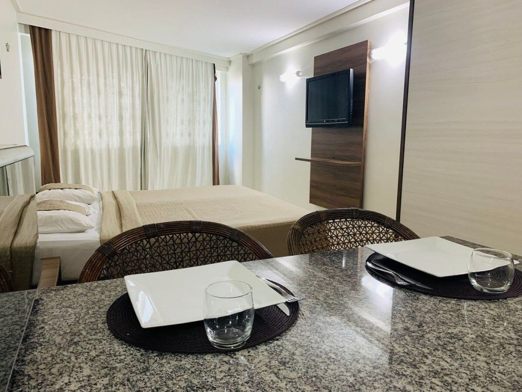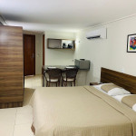 O quarto fica localizado no flat Blue Sunset e possui todos os ambientes integrados. Quarto, balcão de apoio com pia e frigobar e banheiro completo.