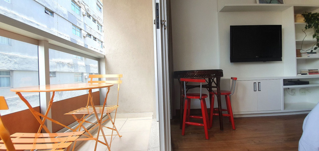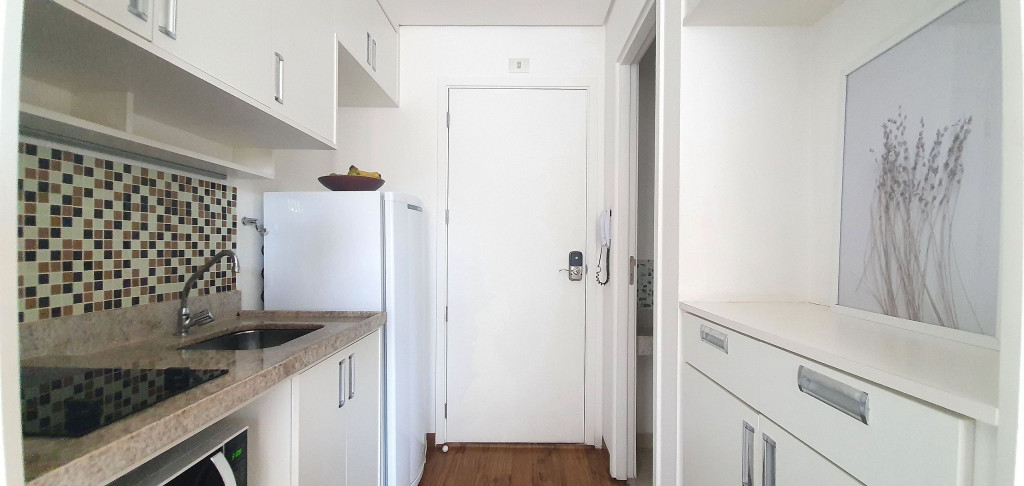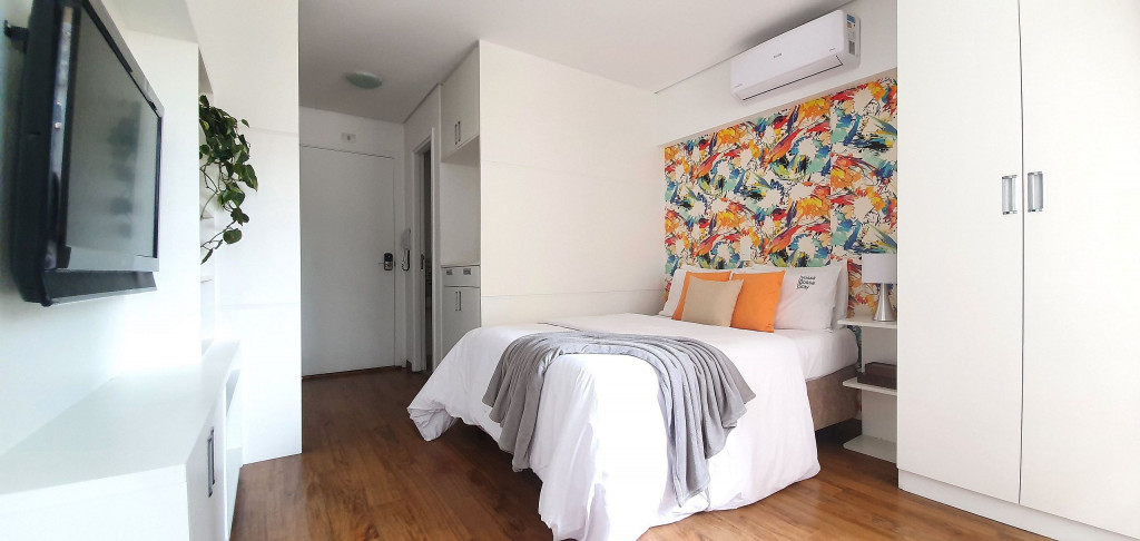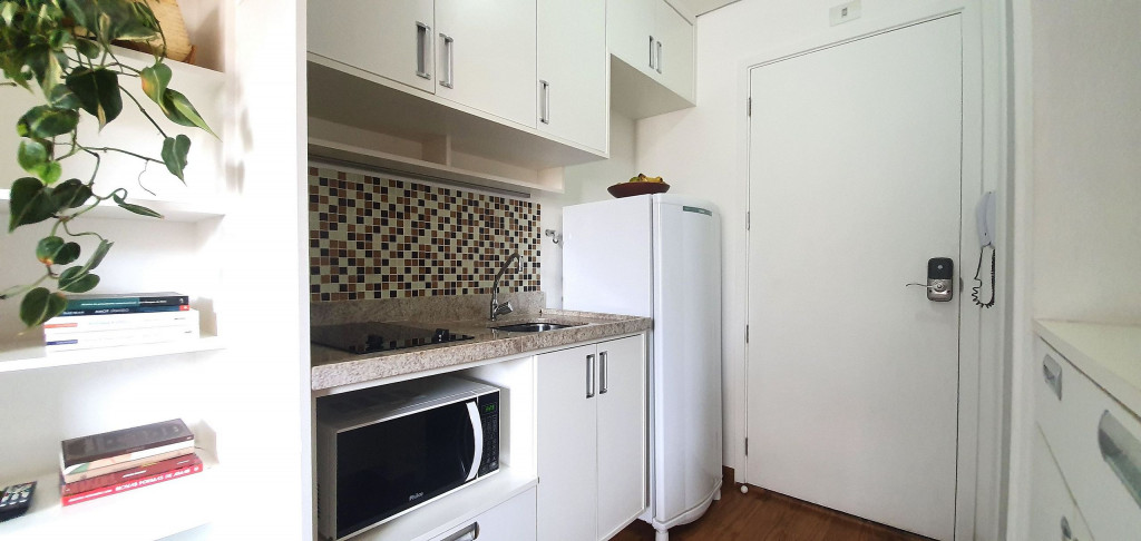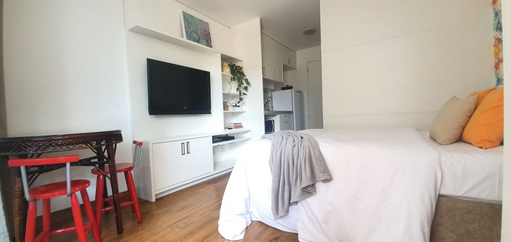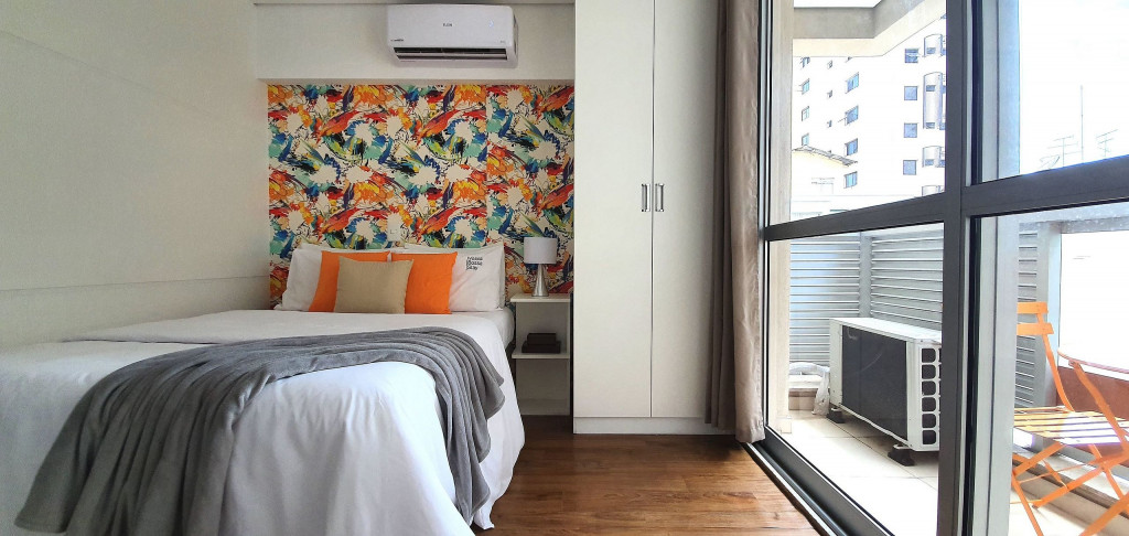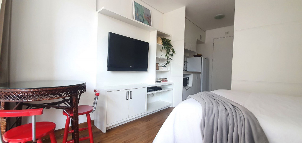 Estúdio privativo de 22 m2, mobiliado, com cozinha, banheiro, ar condicionado e varanda. Está localizado em prédio moderno com piscina, academia, lavanderia (paga a parte), vaga de garagem, portaria 24 horas e situado proximo da Av Paulista, bem na famosa Rua Augusta.