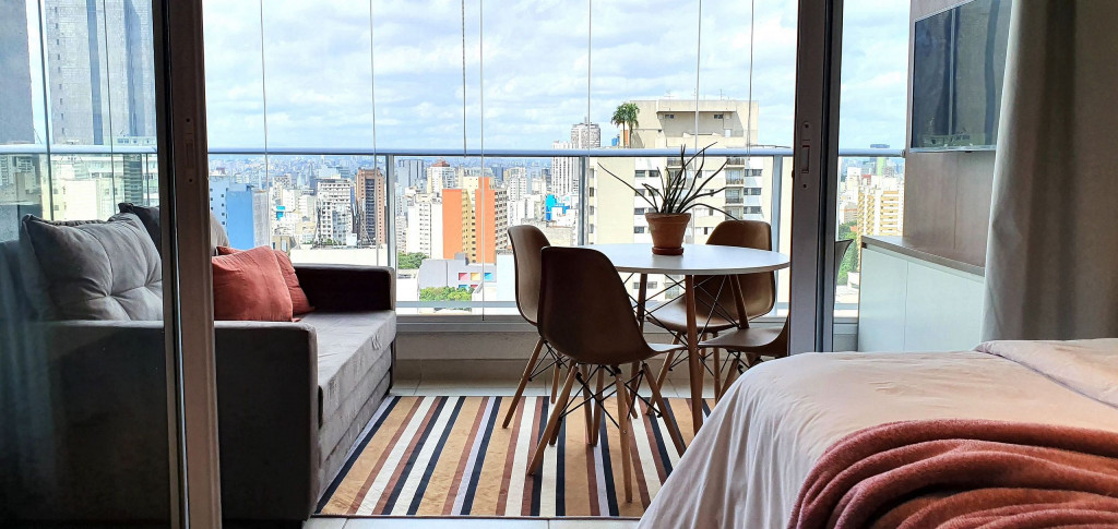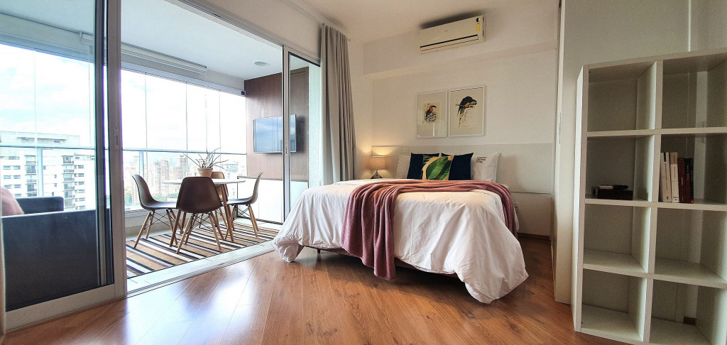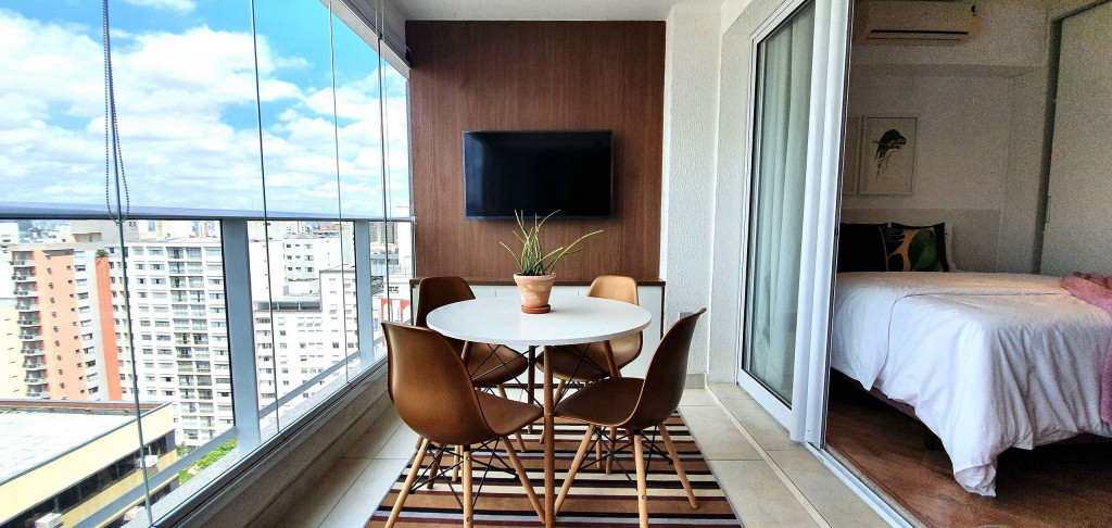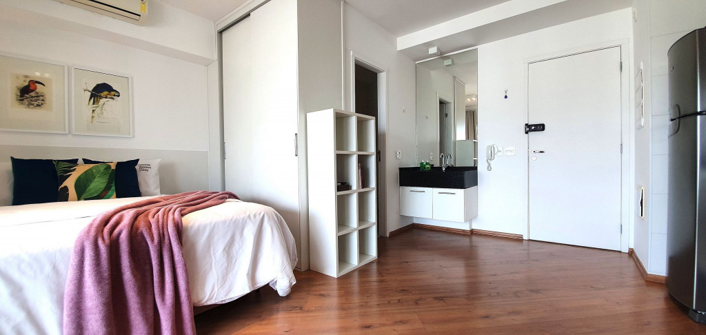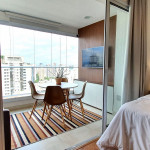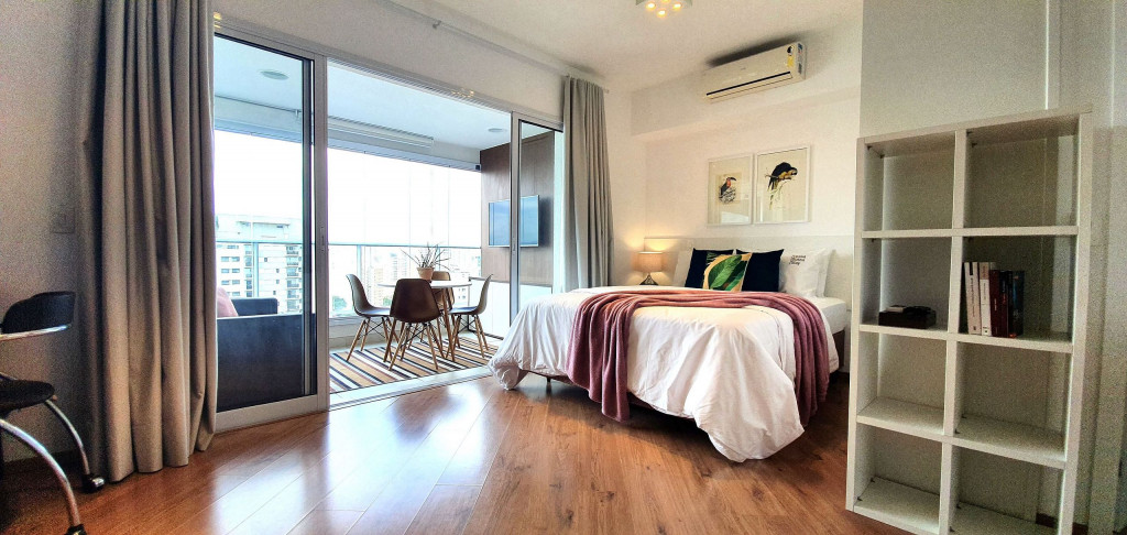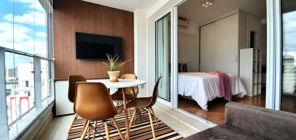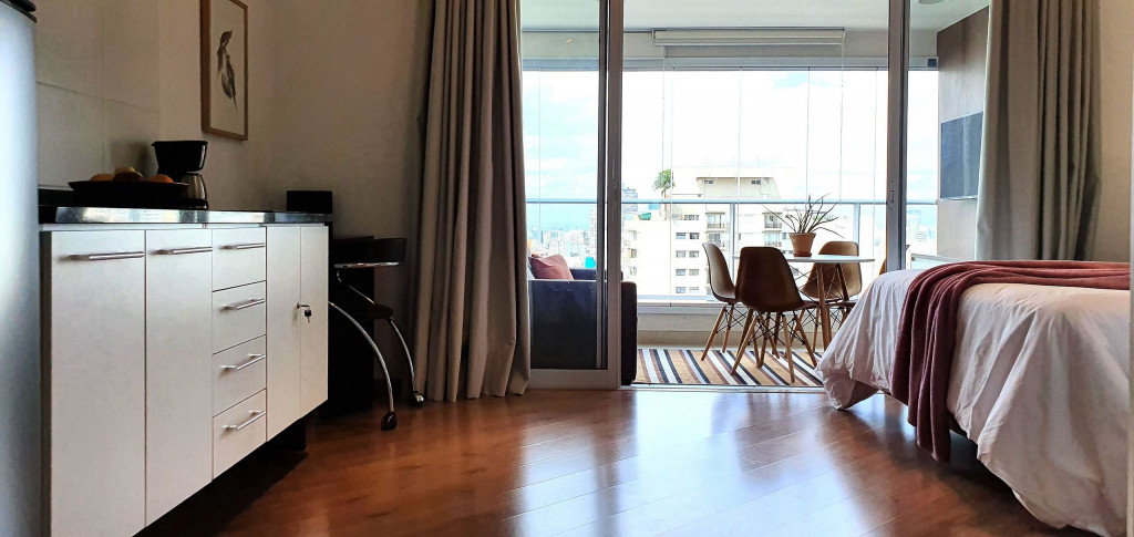 Este estúdio muito bem decorado tem uma cozinha completa, varanda com área de jantar, TV e sofá. Ele também possui AC e chuveiro no banheiro.Está situado no 18°, ocasionando uma vista ampla da cidade, além de ter uma decoração toda pensada pra deixar o espaço aconchegante, além de contar com um ambiente otimizado, com cozinha completa, varanda com área de jantar, um sofá super confortável.