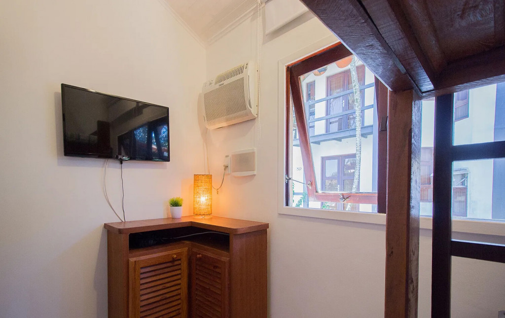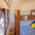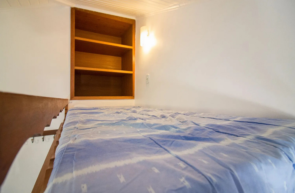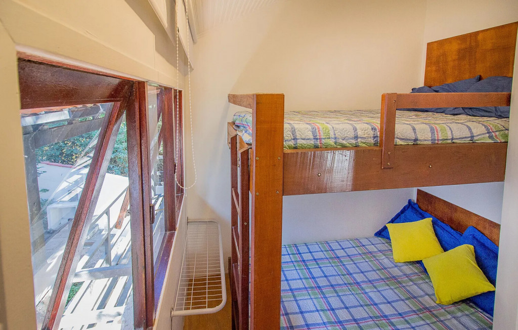 Quarto 2 - cama beliche de casal (colchão macio médio) feita com madeira de demolição e projetada por arquiteto. Dormem 2 pessoas leves em cima e 2 pessoas embaixo, tem TV (canais básicos) e ar condicionado e pequeno ventilador portátil.