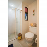 Banheiros com chuveiro elétrico e box de blindex temperado.