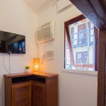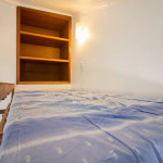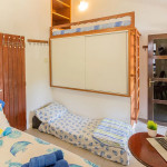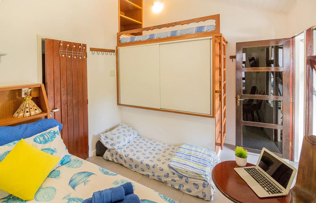 Quarto 1 - 1 cama box de casal tamanho padrão (colchão macio médio) e 1 cama de solteiro (colchão macio médio) suspensa em cima do armário, TV (canais básicos), ventilador de teto e ar condicionado.