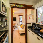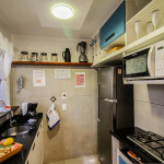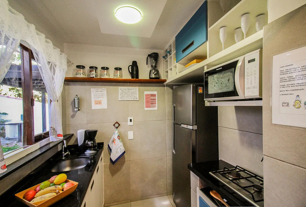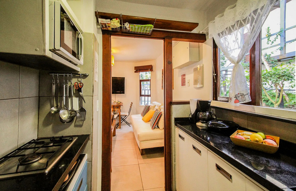 Cozinha- compacta, porém, completa , com microondas, sanduicheira, cafeteira, liquidificador e todos os utensílios necessários.