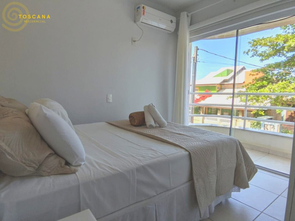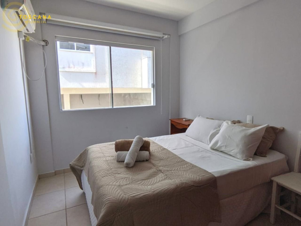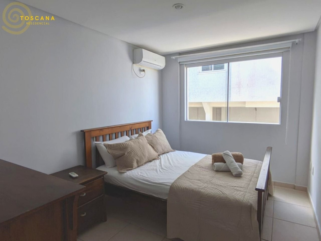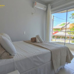 01 Dormitório suíte com acomodação para 02 pessoas, cama box de casal. Este dormitório conta com um ar condicionado split e porta de acesso a varanda inferior.