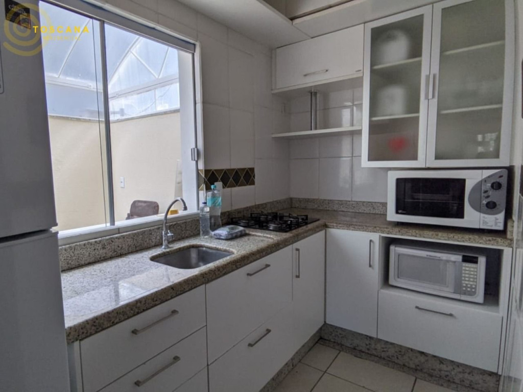 Cozinha equipada com fogão a gás, geladeira, microondas e utensílios básicos. Parte superior com acesso por escada: