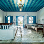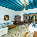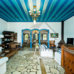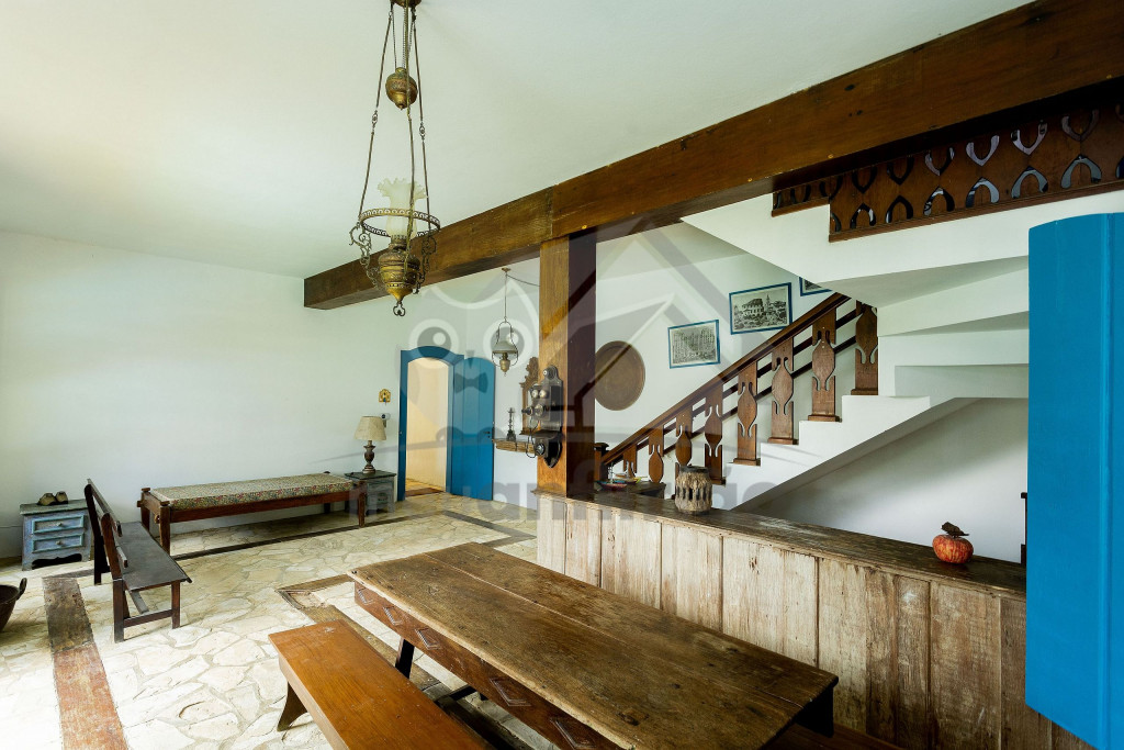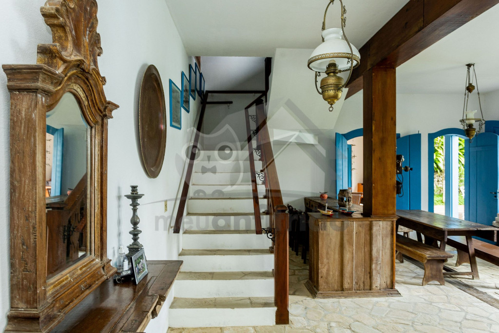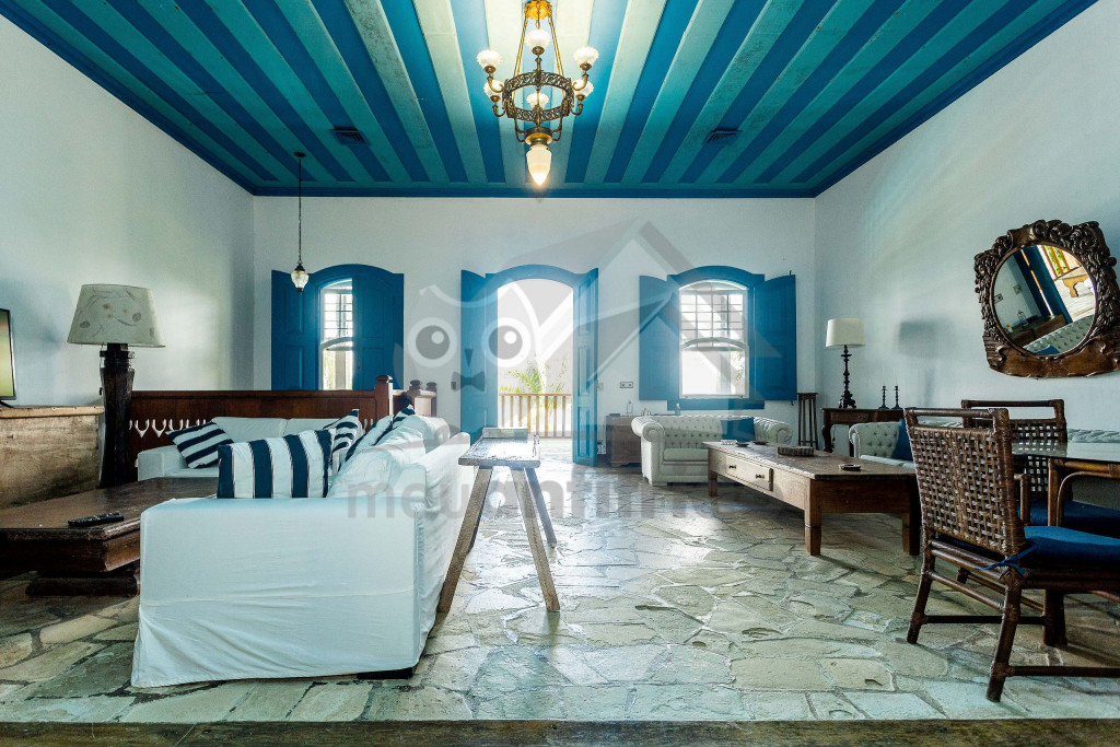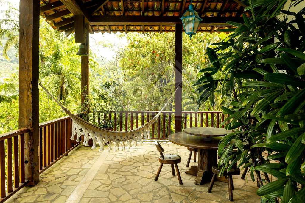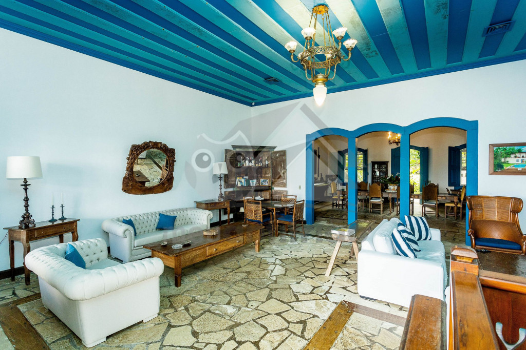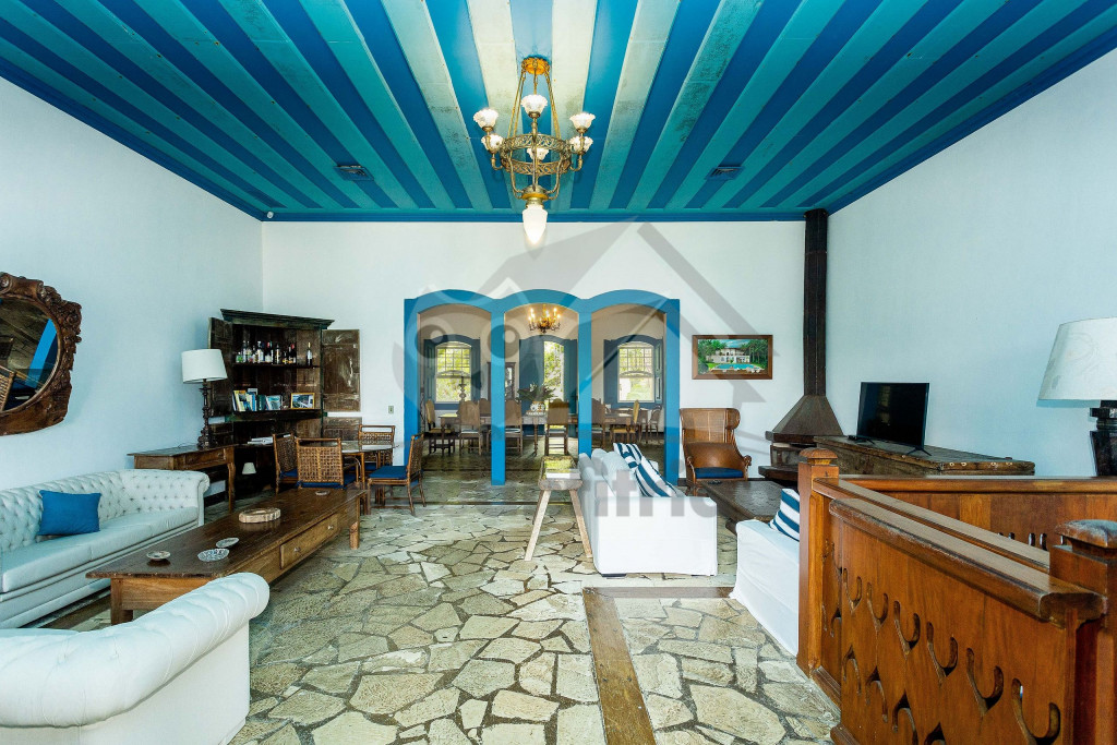 Logo ao entrar na casa, o hóspede terá acesso à uma sala de estar ampla com sofás, lareira e televisão. Dela, chega-se à uma varanda com sofás e redes com vista para a piscina.