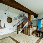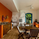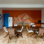 A cozinha é completa com os utensílios necessários para e a estadia. Nela, há uma bancada e uma mesa para refeições com lugar para oito pessoas.