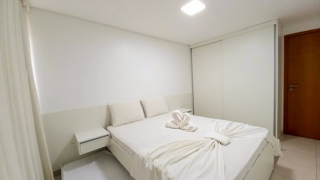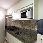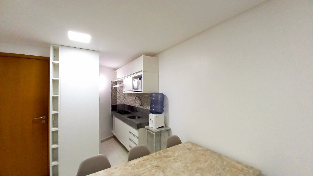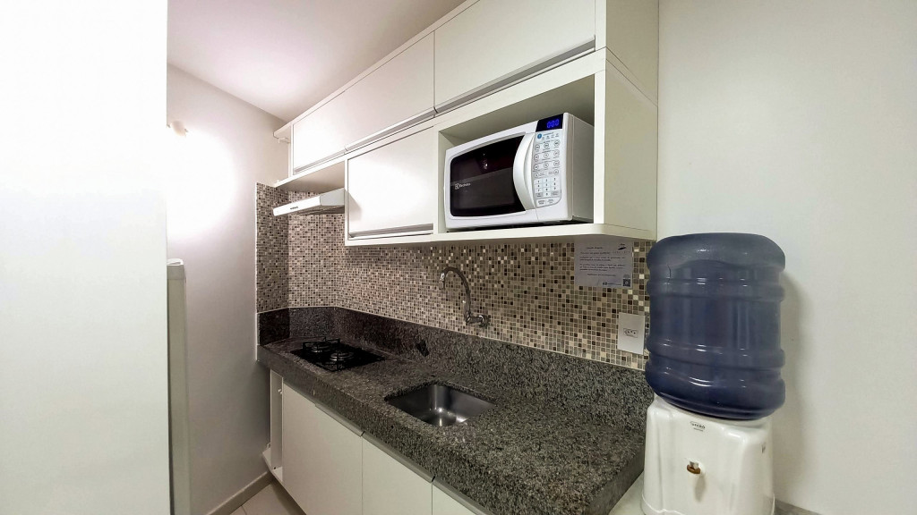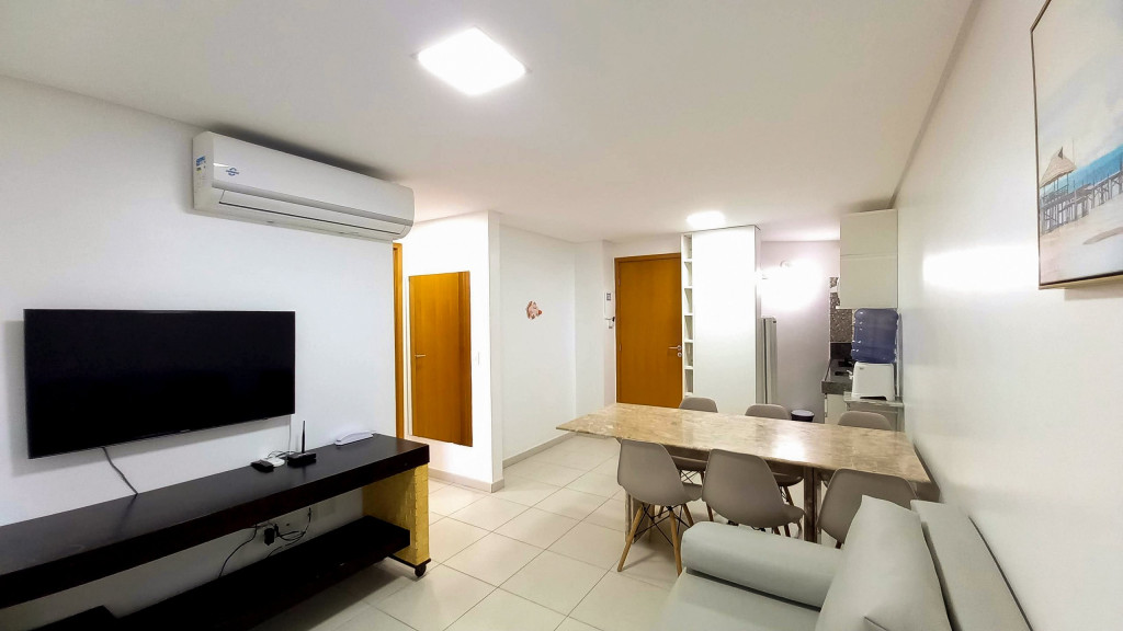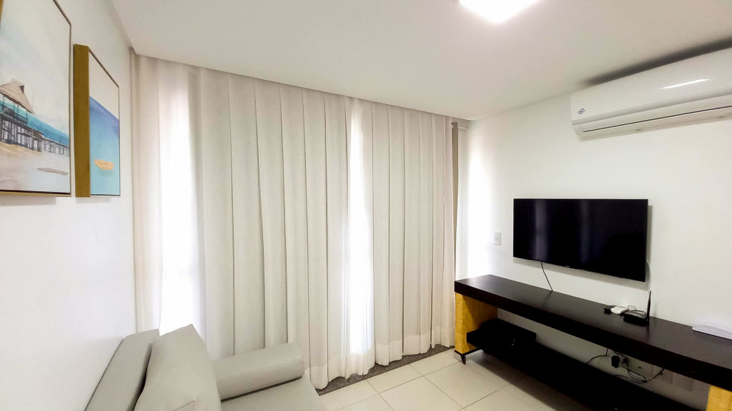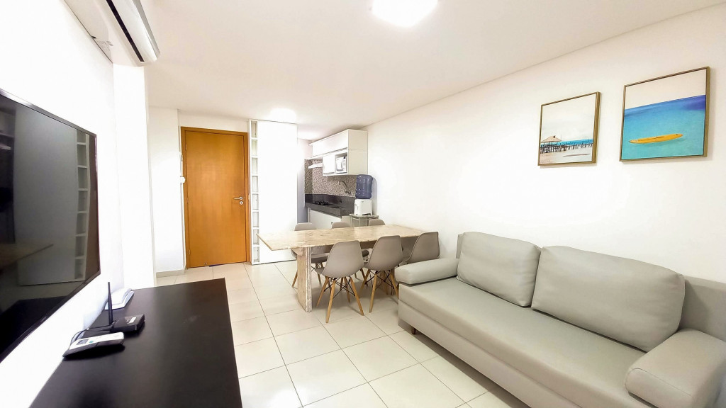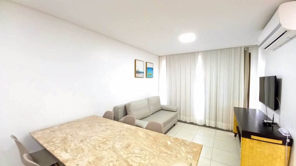 Na sala de estar você encontrará uma decoração agradável, TV, sofá cama de casal e ar condicionado. A cozinha é completa e possui itens como louça, copos, panelas, talheres, sanduicheira, cafeteira, micro-ondas, fogão 02 bocas, geladeira e diversos utensílios. Além disso, há uma área para refeições com mesa de mármore grande e 06 cadeiras. O flat possui 01 banheiro completo.