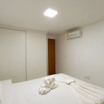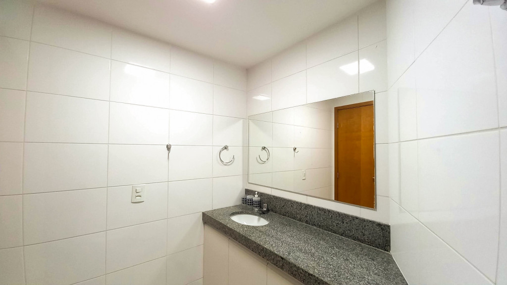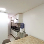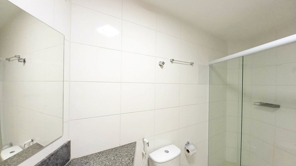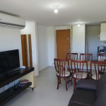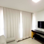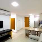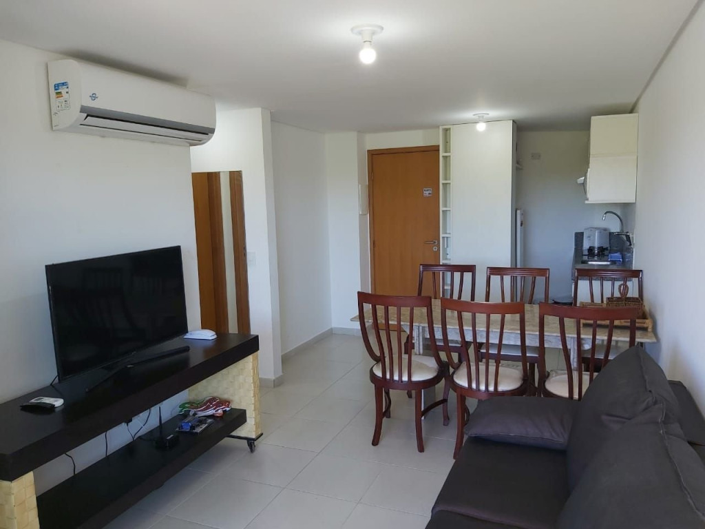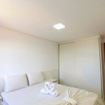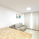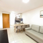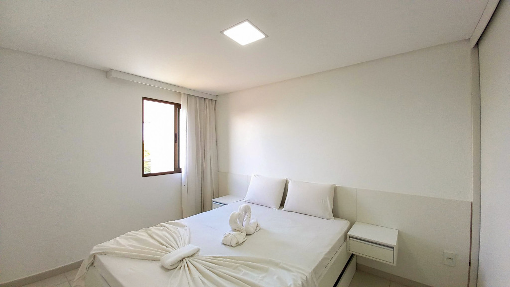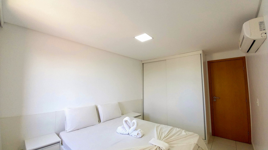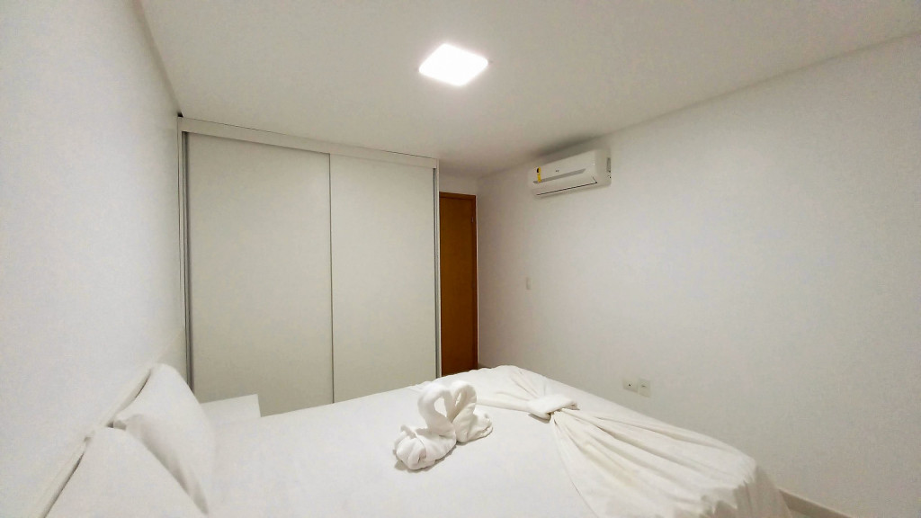 Na sala de estar você encontrará uma decoração agradável, TV, sofá cama de casal e ar condicionado. A cozinha é completa e possui itens como louça, copos, panelas, talheres, sanduicheira, cafeteira, micro-ondas, fogão 02 bocas, geladeira e diversos utensílios. Além disso, há uma área para refeições com mesa de mármore grande e 06 cadeiras. O flat possui 01 banheiro completo.