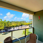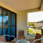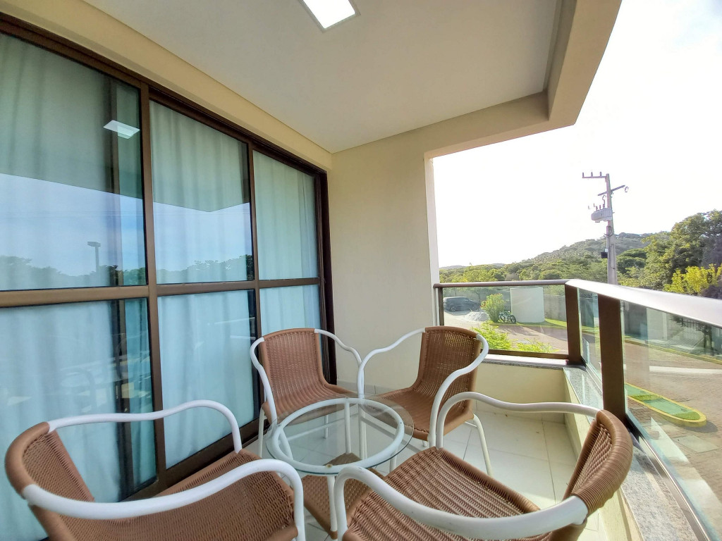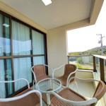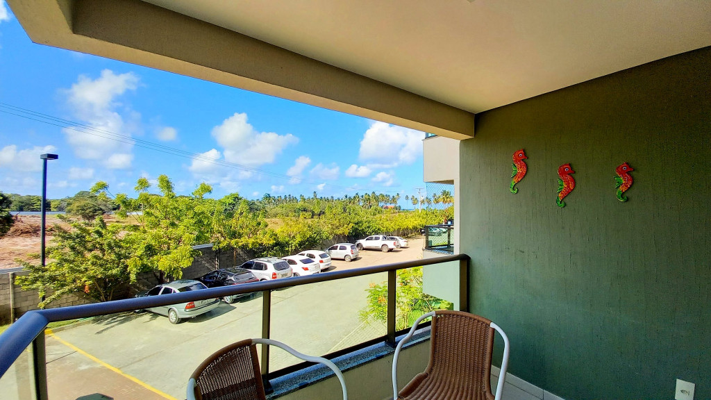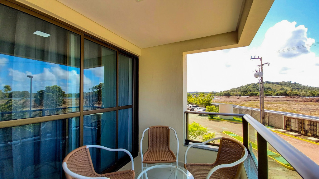 O flat se encontra no primeiro andar do prédio com vista para o jardim e estacionamento, possui também uma linda varanda com quarto cadeiras e mesa
