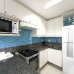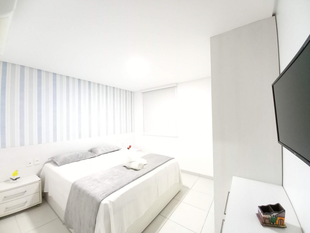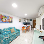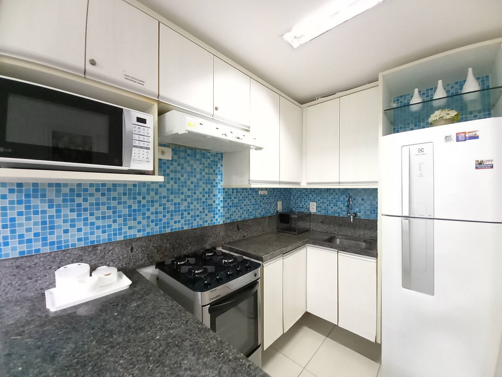 Na sala de estar você encontrará uma decoração agradável, TV a cabo (Sky), sofá e ar condicionado. A cozinha é completa e possui diversas comodidades como louça, copos, panelas, talheres, sanduicheira, cafeteira elétrica, air fryer, microondas, fogão de 04 bocas, gelágua, geladeira, liquidificador, cooler e diversos utensílios, além de sala de jantar com mesa e 4 cadeiras. O flat possui 02 banheiros completos (box, armário, ducha higiênica, chuveiro elétrico).