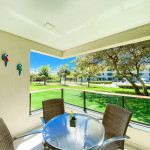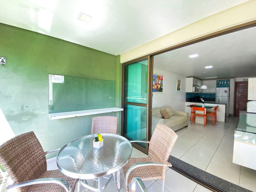 O flat se encontra no térreo do prédio com vista para piscina, possui também uma linda varanda com quatro cadeiras e mesa.