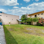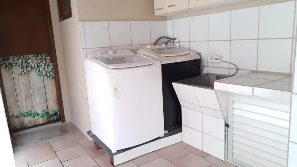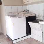 Lavanderia com maquina de lavar, tanque de roupas e varal;