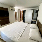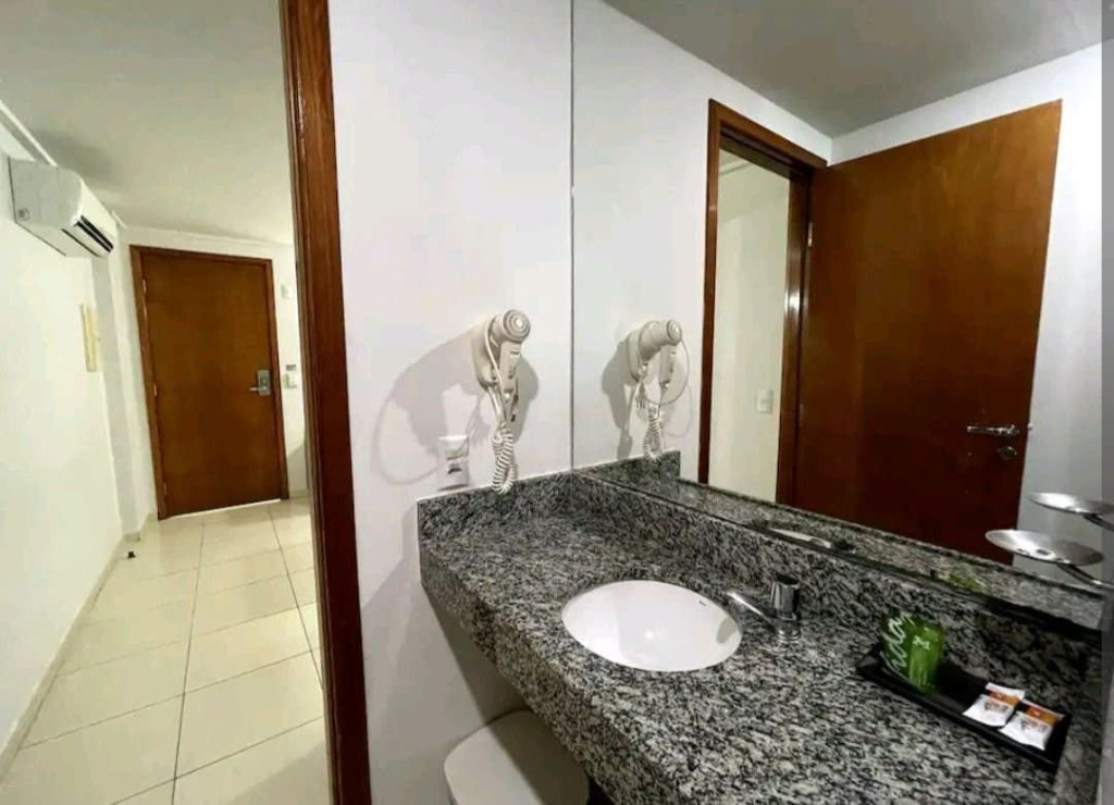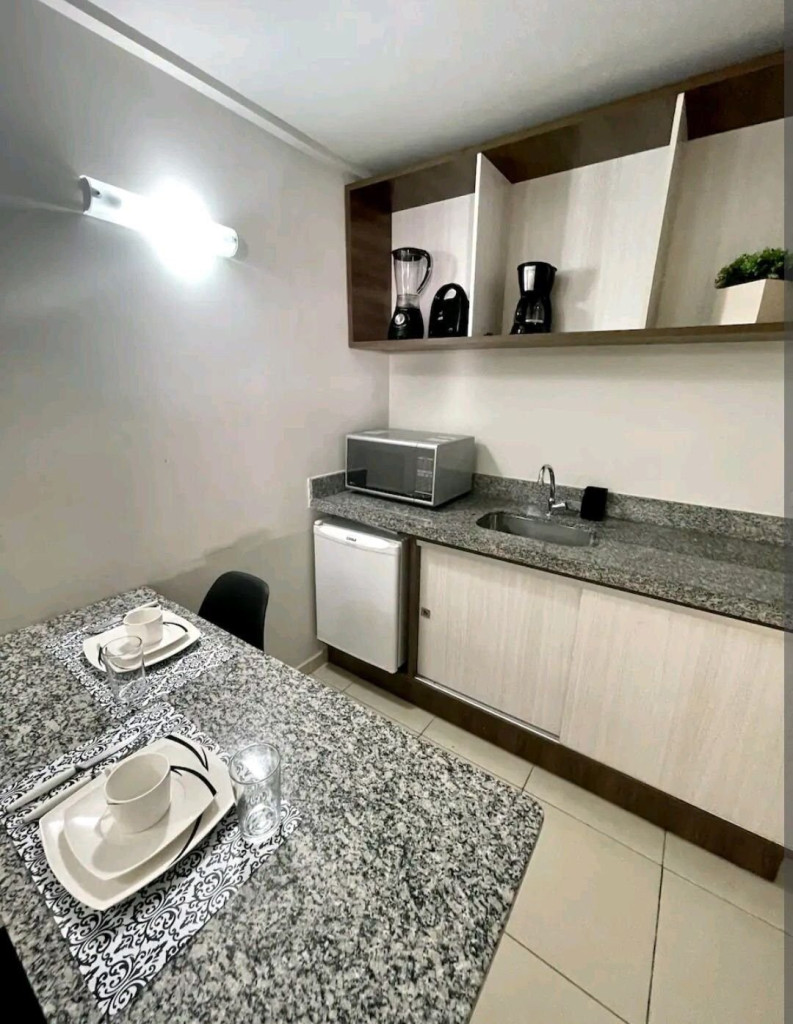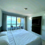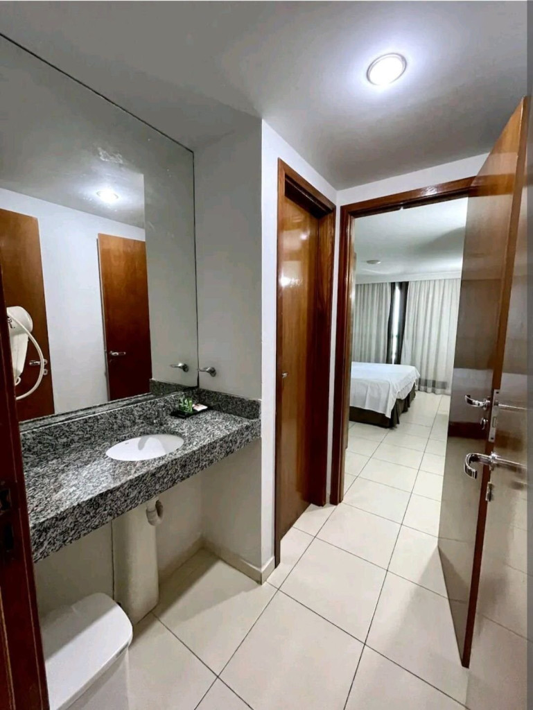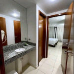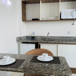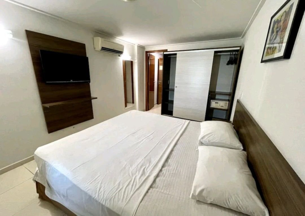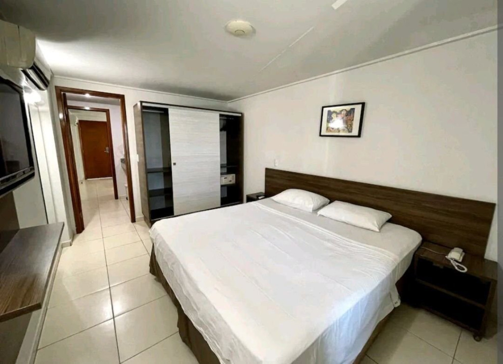 O quarto fica localizado no flat Blue Sunset e possui todos os ambientes integrados.