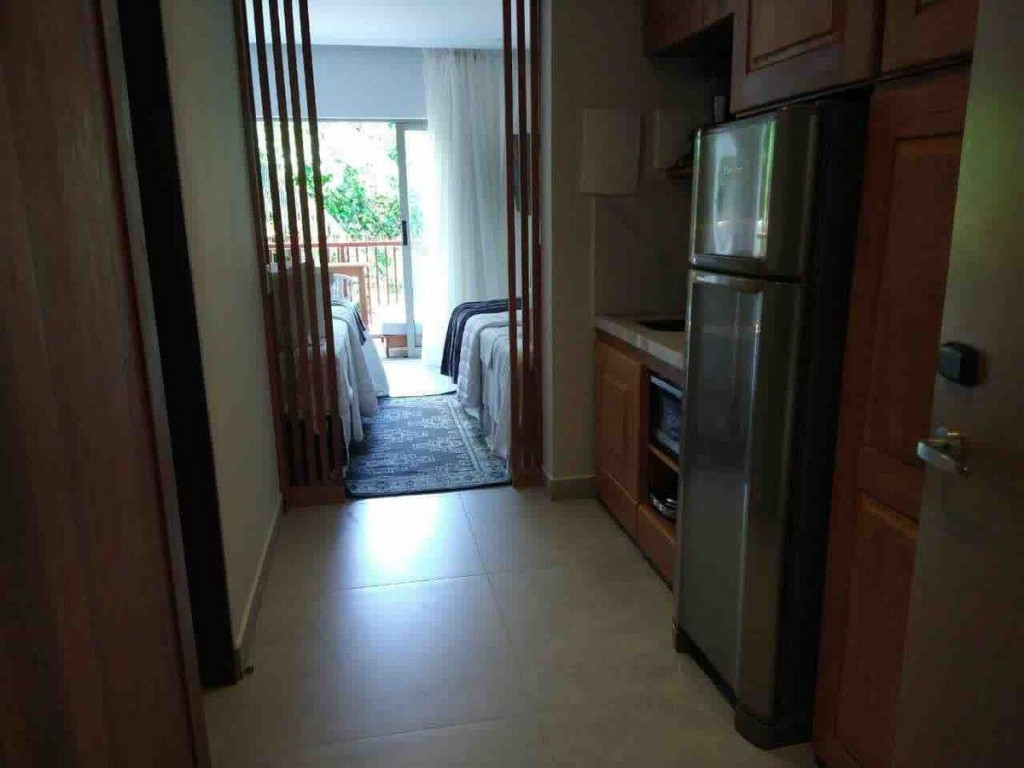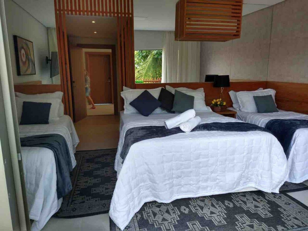 O hotel onde se localiza o flat possui piscina adulta e infantil, praia artificial com peixes, academia, SPA com sauna (pago) e estacionamento privativo. - Quarto: 1 cama de casal Queen, 2 camas de solteiro, TV, ar-condicionado, guarda-roupa; - Cozinha compacta: utensílios de cozinha (talheres, copos e pratos, fogão elétrico, geladeira,liquidificador, assadeira, cafeteira, panelas, microonda, etc..); - Banheiro completo: chuveiro elétrico, secador, utensílios básicos; - Varanda: mesa e cadeiras; chaise/sofá A propriedade possui wifi.