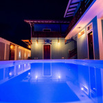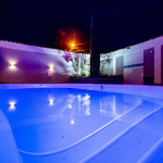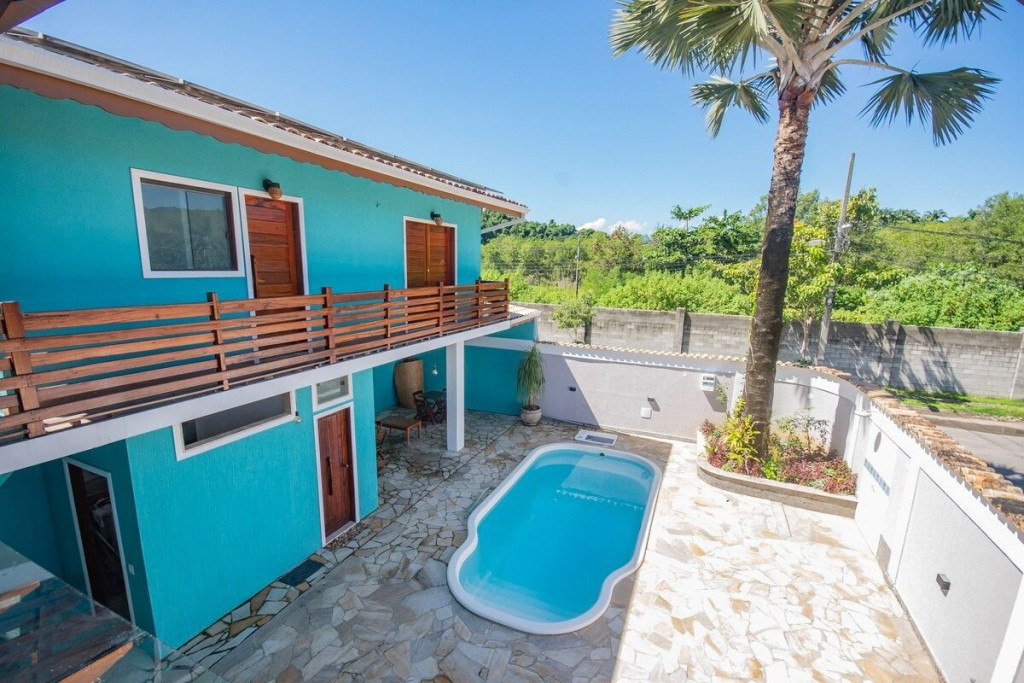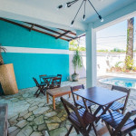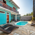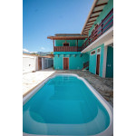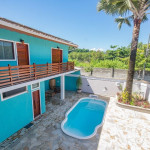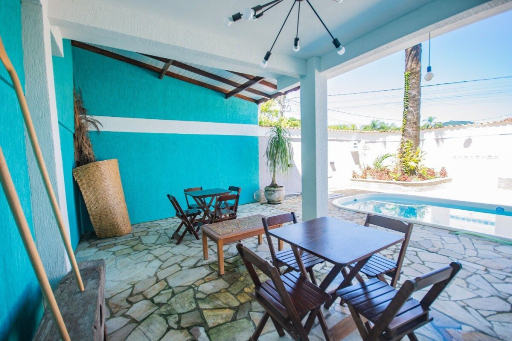 No condomínio temos uma piscina e uma área com mesas que podem ser utilizadas pelos hóspedes.