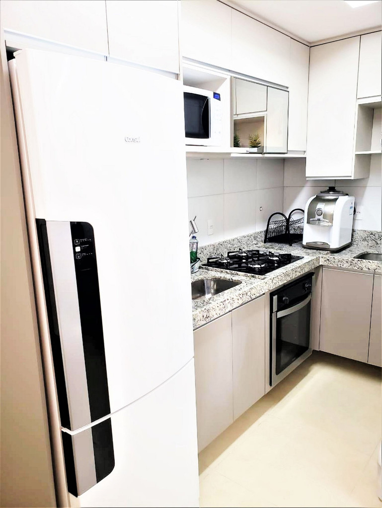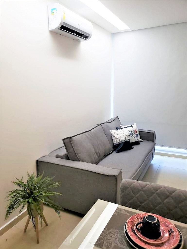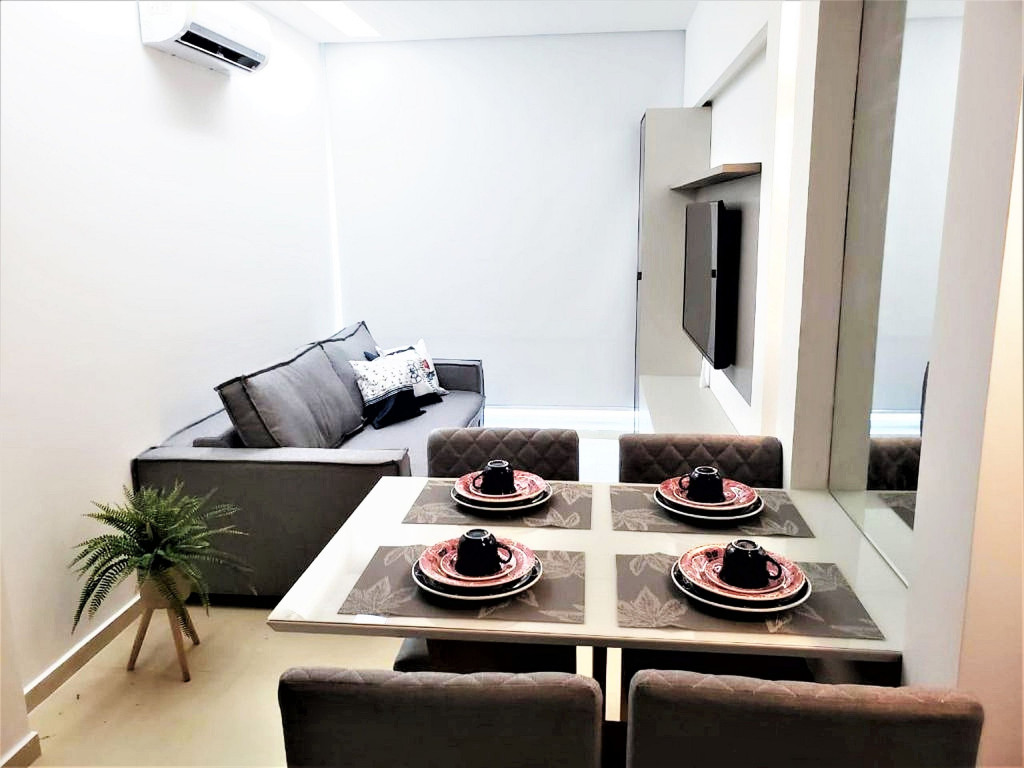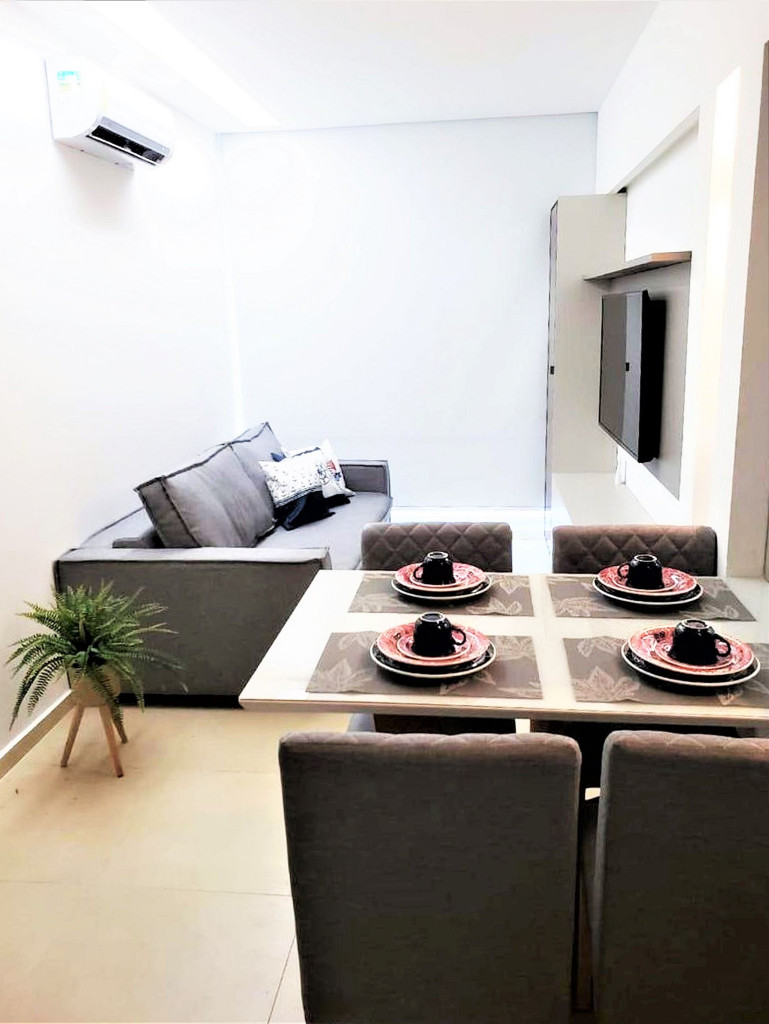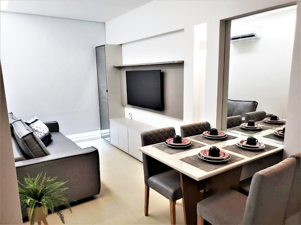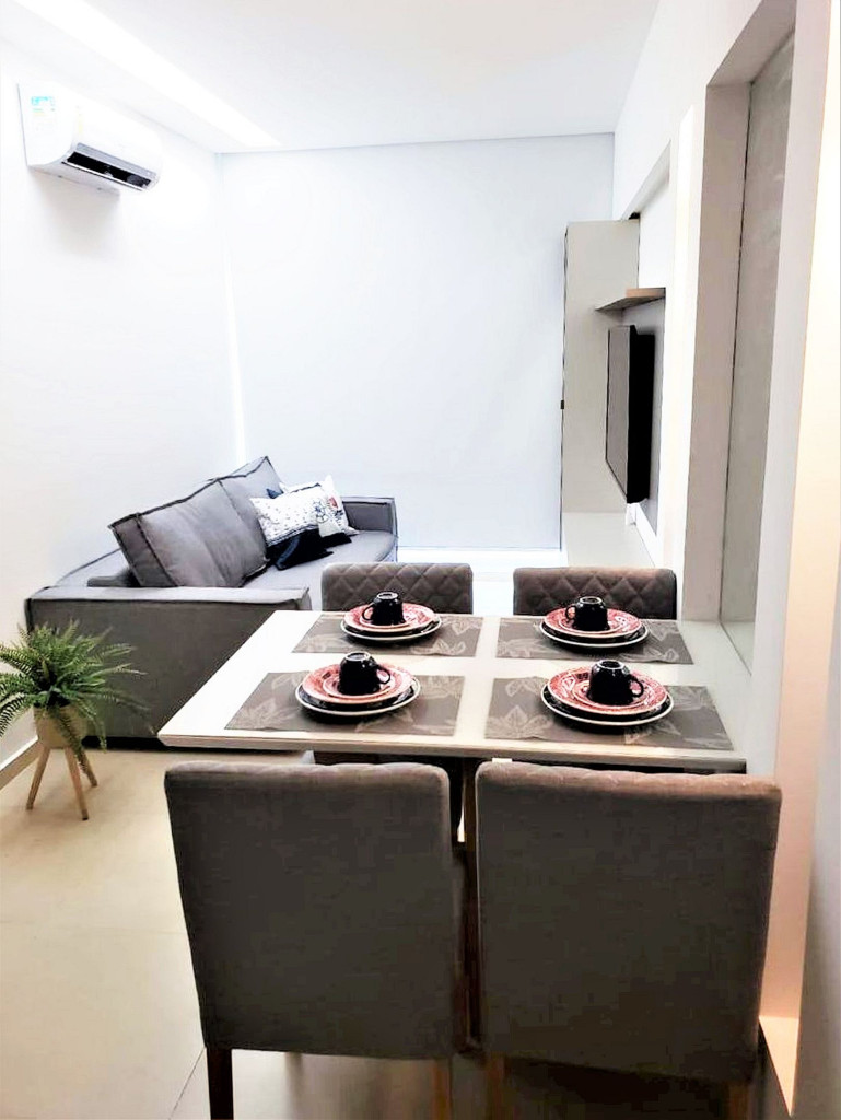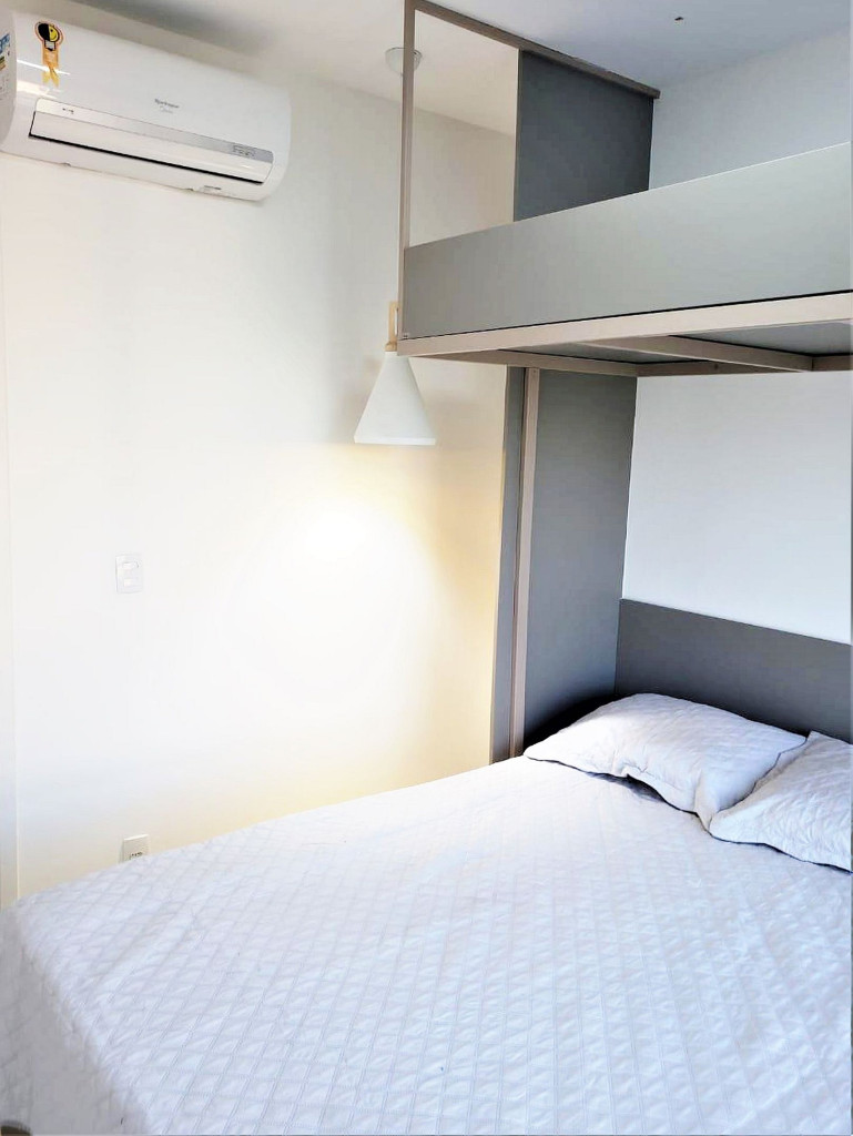 Flat completo composto de sala de estar e jantar, cozinha completa com todos os utensílios domésticos, banheiro social com chuveiro elétrico, 1 quarto inteiro com cama de casal, 1 Beliche + 1 Bicama, 1 Sofá-Cama. Ar condicionado.