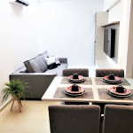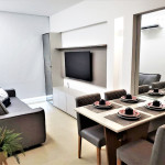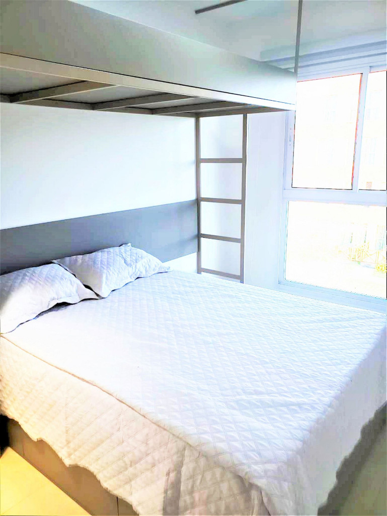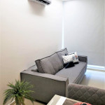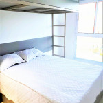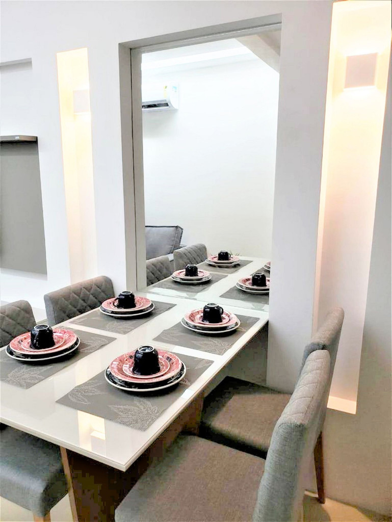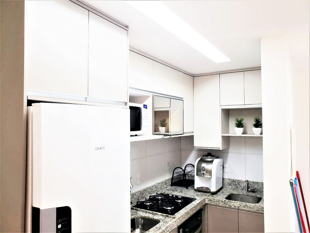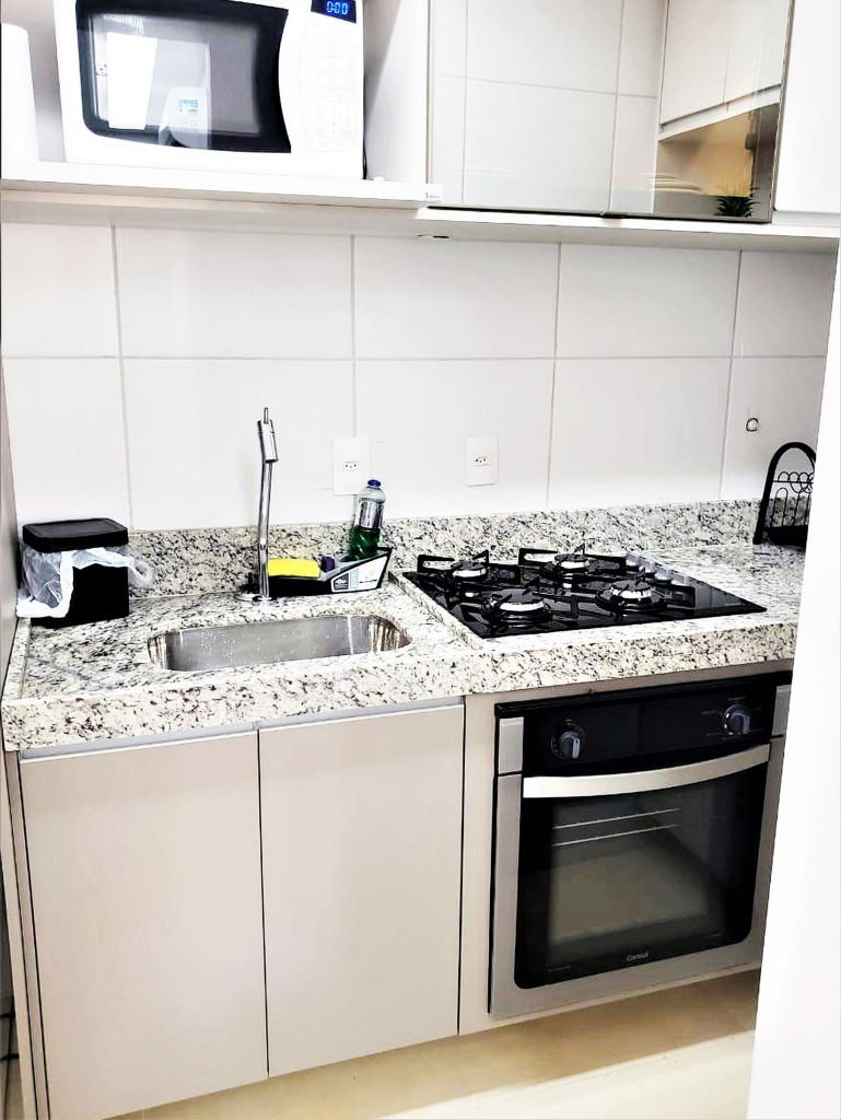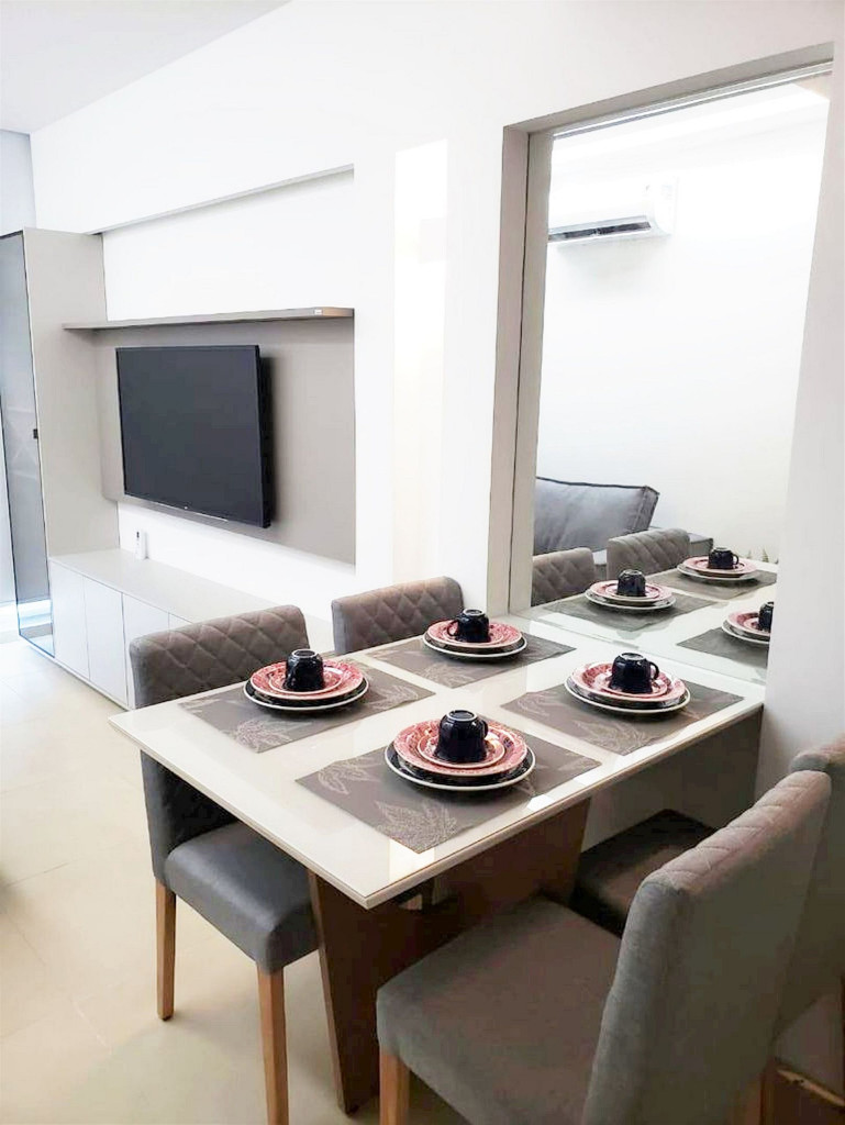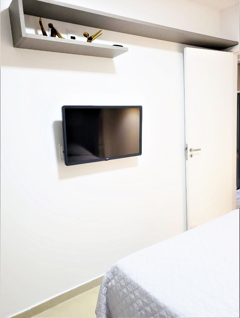 Flat completo composto de sala de estar e jantar, cozinha completa com todos os utensílios domésticos, banheiro social com chuveiro elétrico, 1 quarto inteiro com cama de casal, 1 Beliche + 1 Bicama, 1 Sofá-Cama. Ar condicionado.