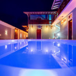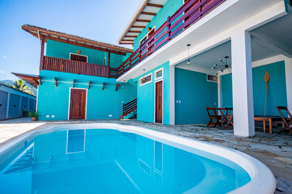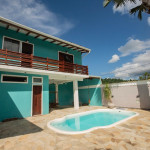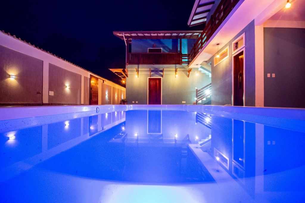 No condomínio temos uma piscina e uma área com mesas que podem ser utilizadas pelos hóspedes.