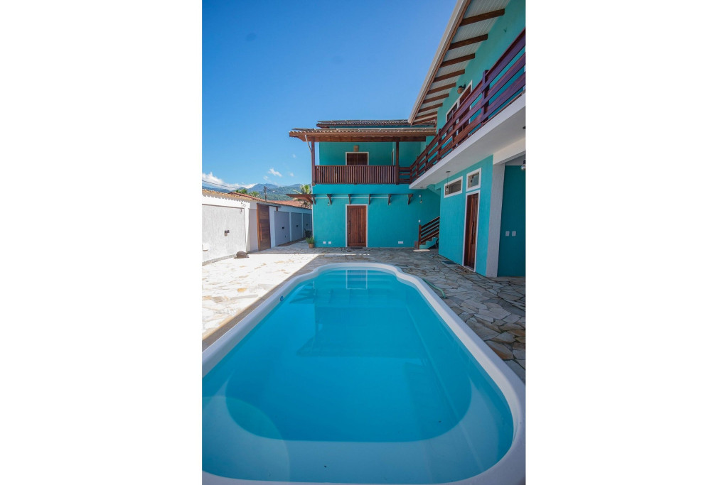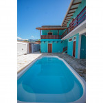 No condomínio temos uma piscina e uma área com mesas que podem ser utilizadas pelos hóspedes.