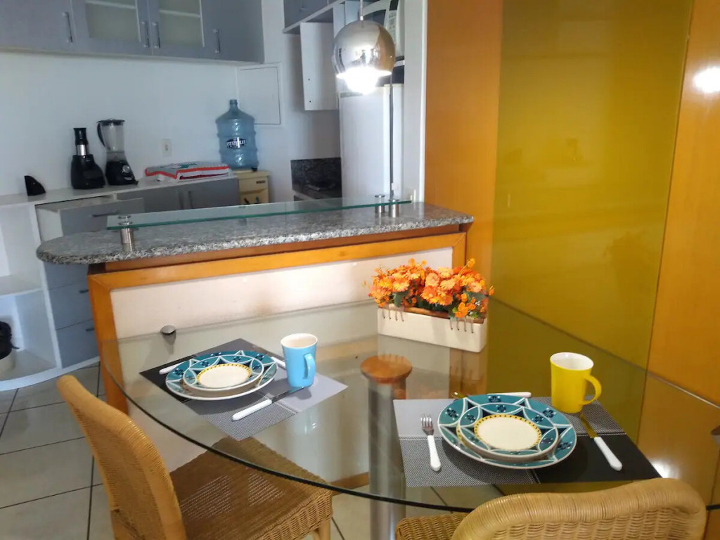 O apartamento possui uma suíte master com banheira, sala de estar/jantar, varanda com vista mar, cozinha tipo americana, cama casal king, mesa de apoio para estudo ou trabalho, mobília moderna e utensílios domésticos básicos para fazer pequenas refeições.