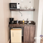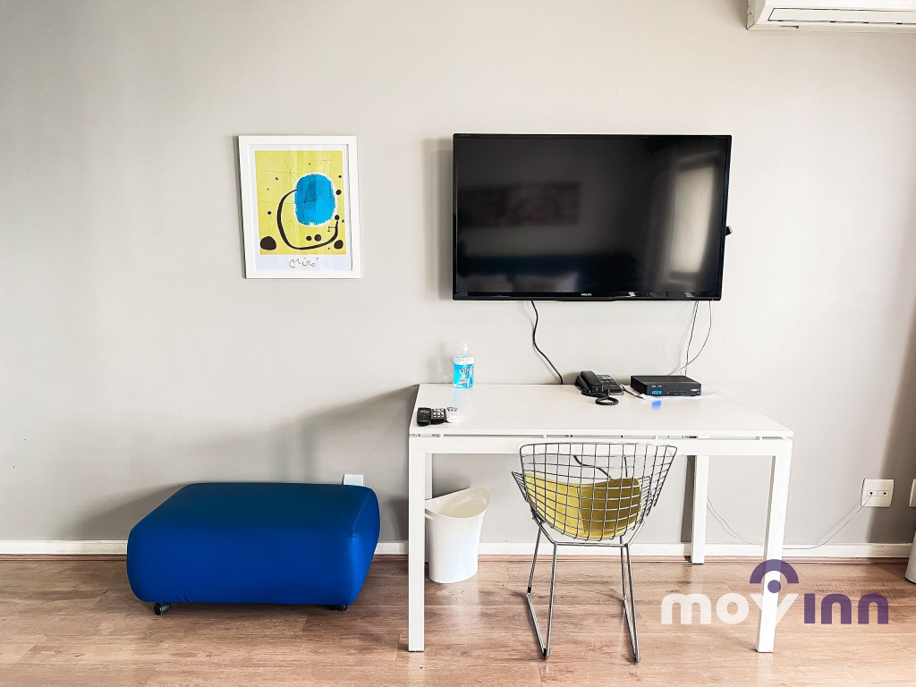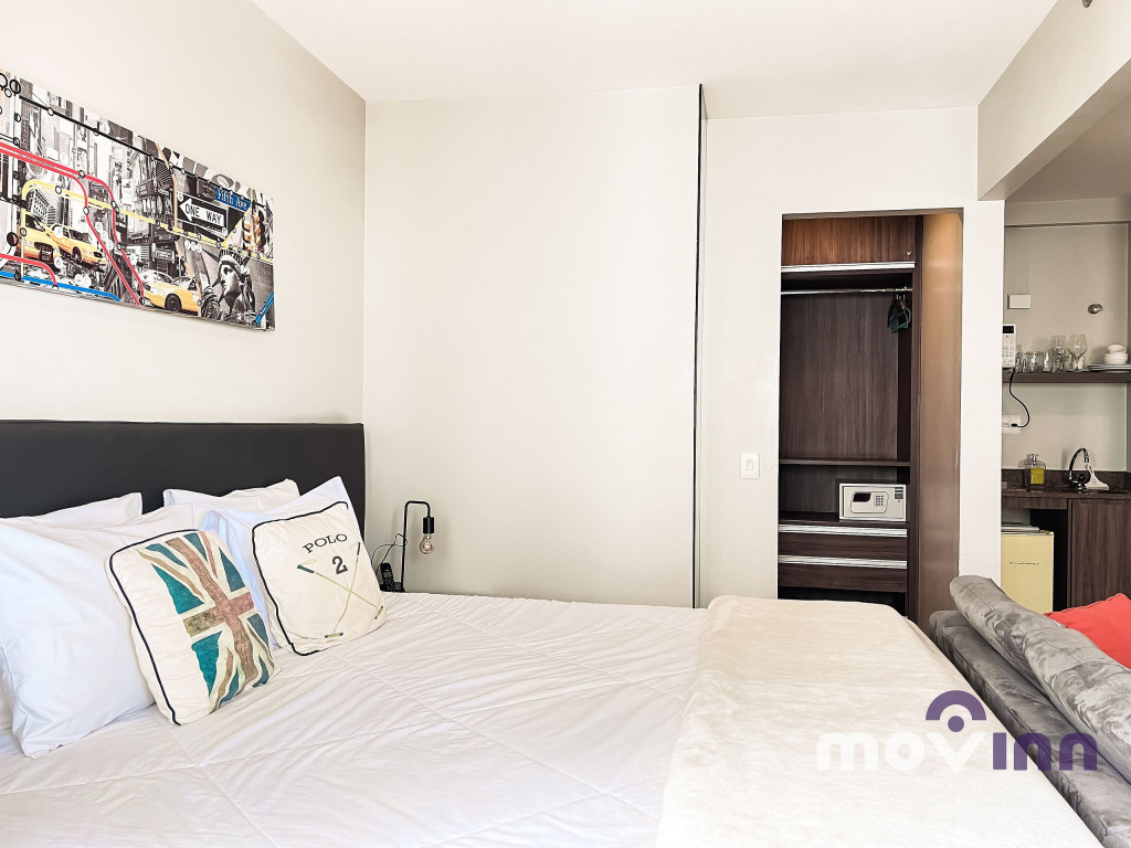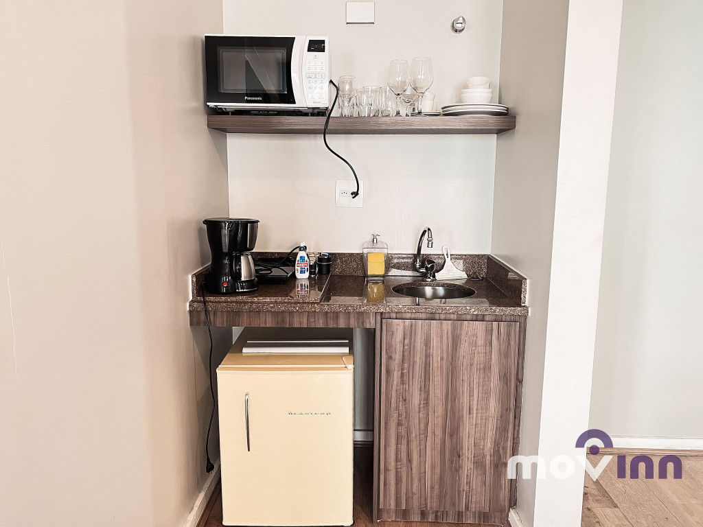 O apartamento de 37 m² possui cama Queen Size por padrão, terraço, Wi-Fi cortesia, ar condicionado, TV Smart com programação a cabo, sofá confortável, mini cozinha com cooktop, micro-ondas, Cafeteira, utensílios básicos e serviço de limpeza e arrumação básica inclusa diariamente.