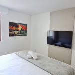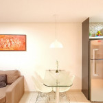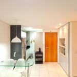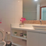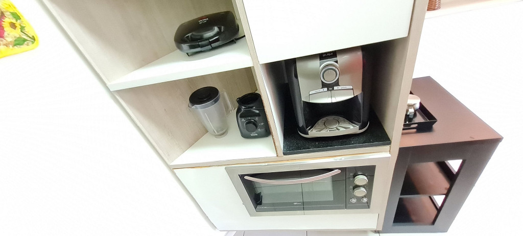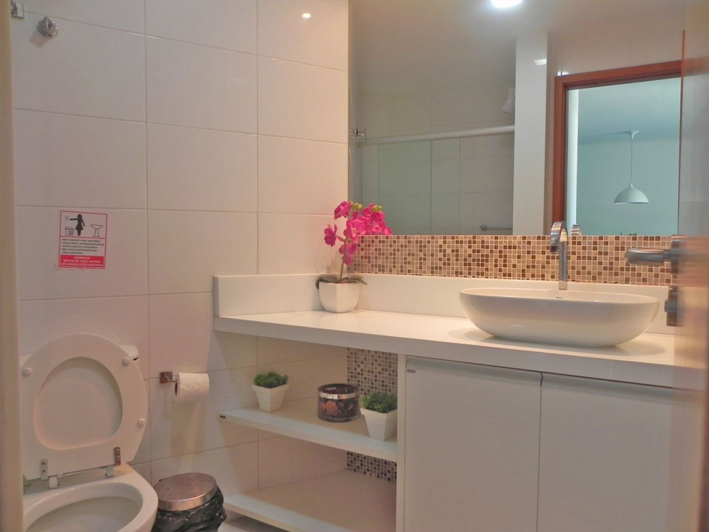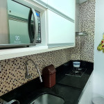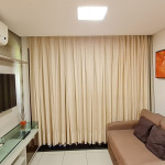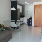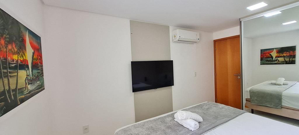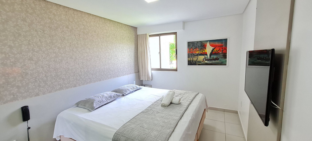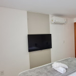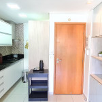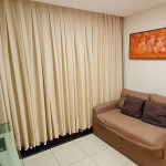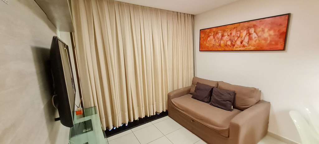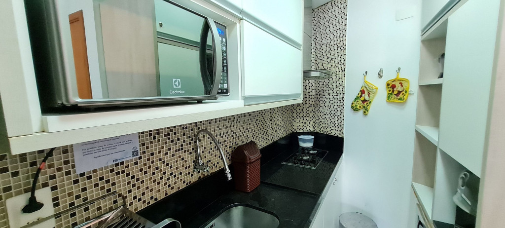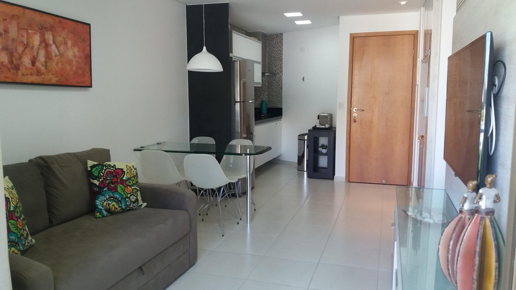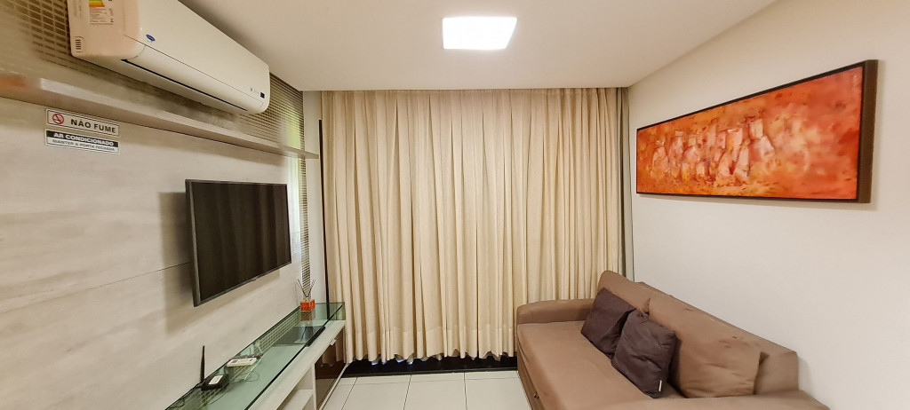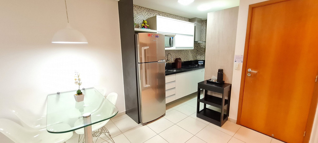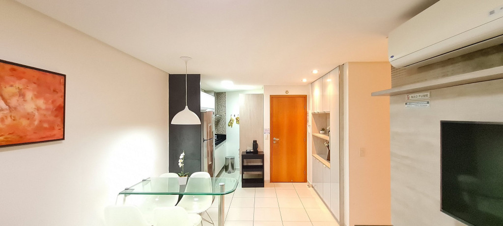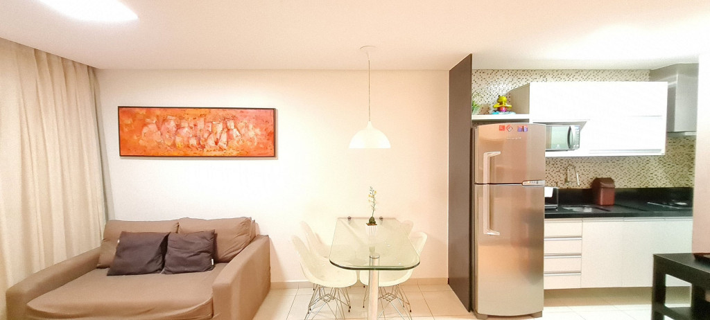 Na sala de estar você encontrará uma decoração agradável, TV, sofá cama de casal e ar condicionado. A cozinha é completa e possui diversas comodidades como louça, copos, panelas, talheres, sanduicheira, micro-ondas, fogão cooktop 02 bocas, geladeira e diversos utensílios, além de sala de jantar com mesa e 4 cadeiras. O flat possui 01 banheiro completo (box, armário, ducha higiênica, chuveiro elétrico).
