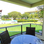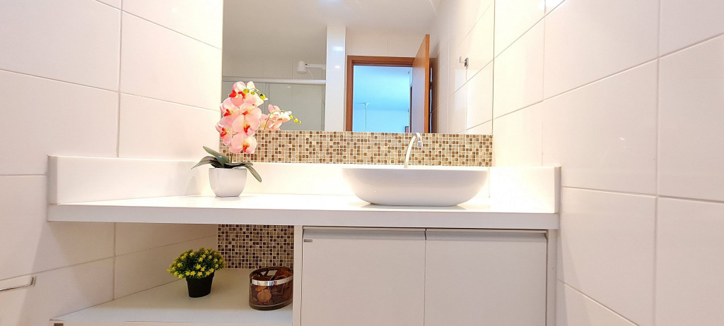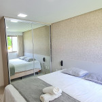 O flat se encontra no térreo do prédio com vista para piscina, possui também uma linda varanda com quatro cadeiras e mesa.