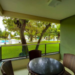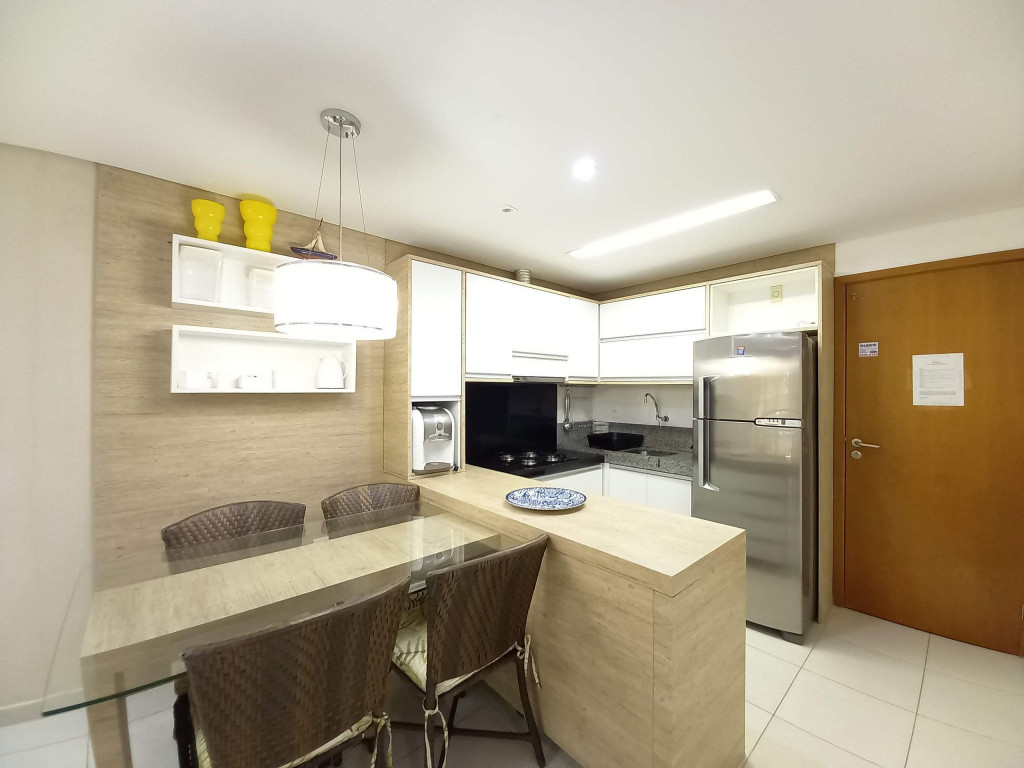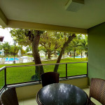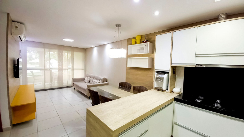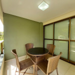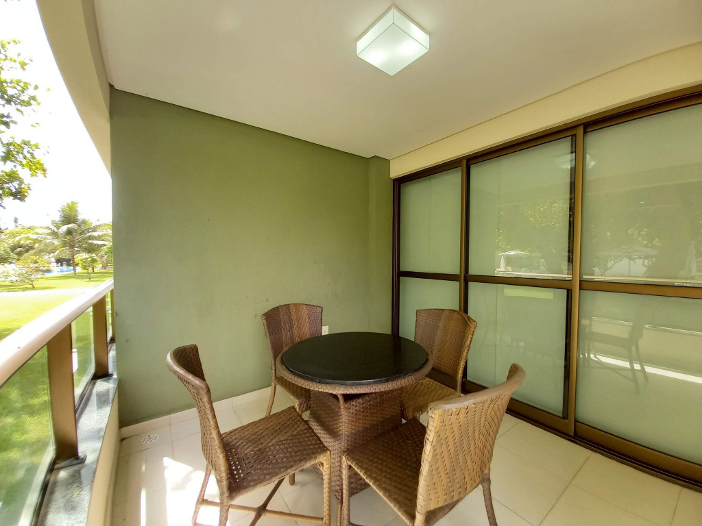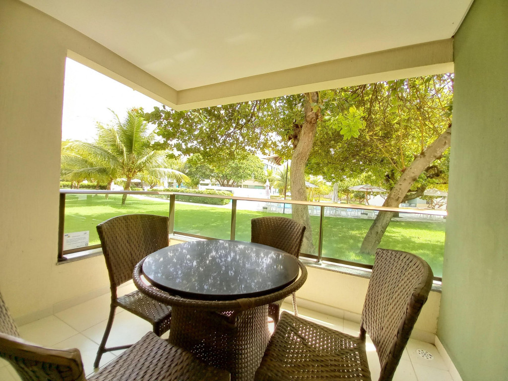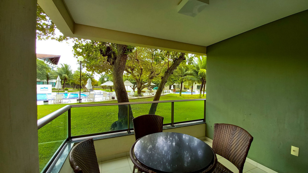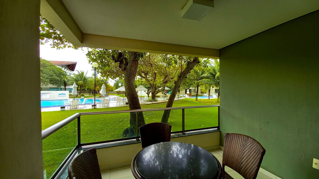 O flat se encontra no térreo do prédio com vista para a piscina e possui uma linda varanda com seis cadeiras e mesa.
