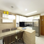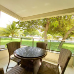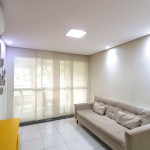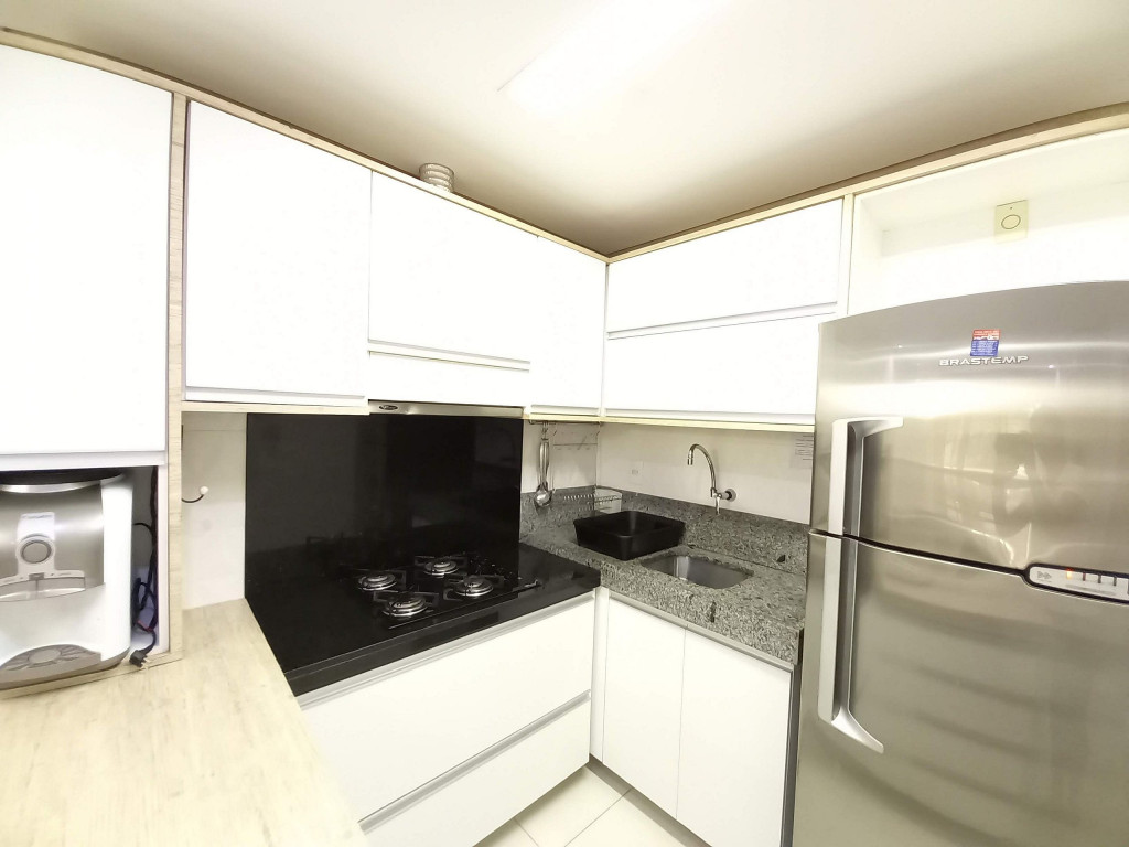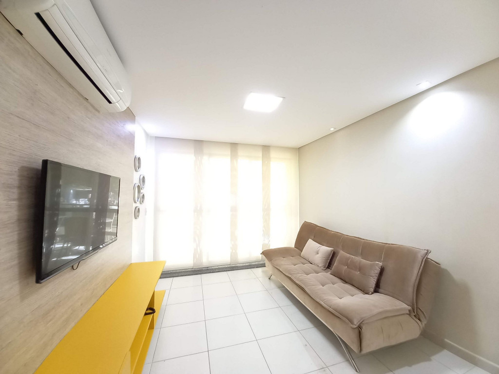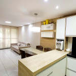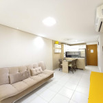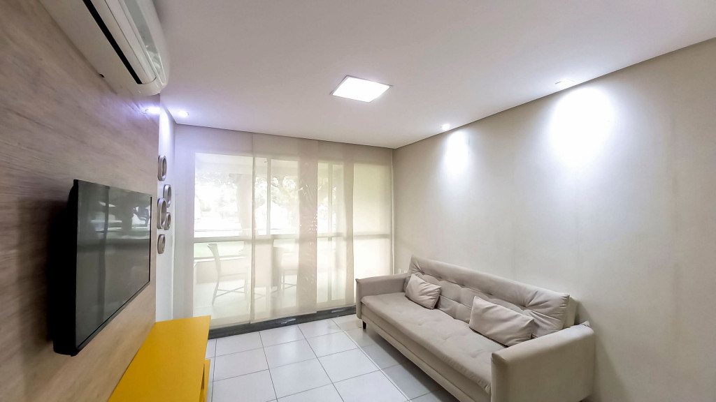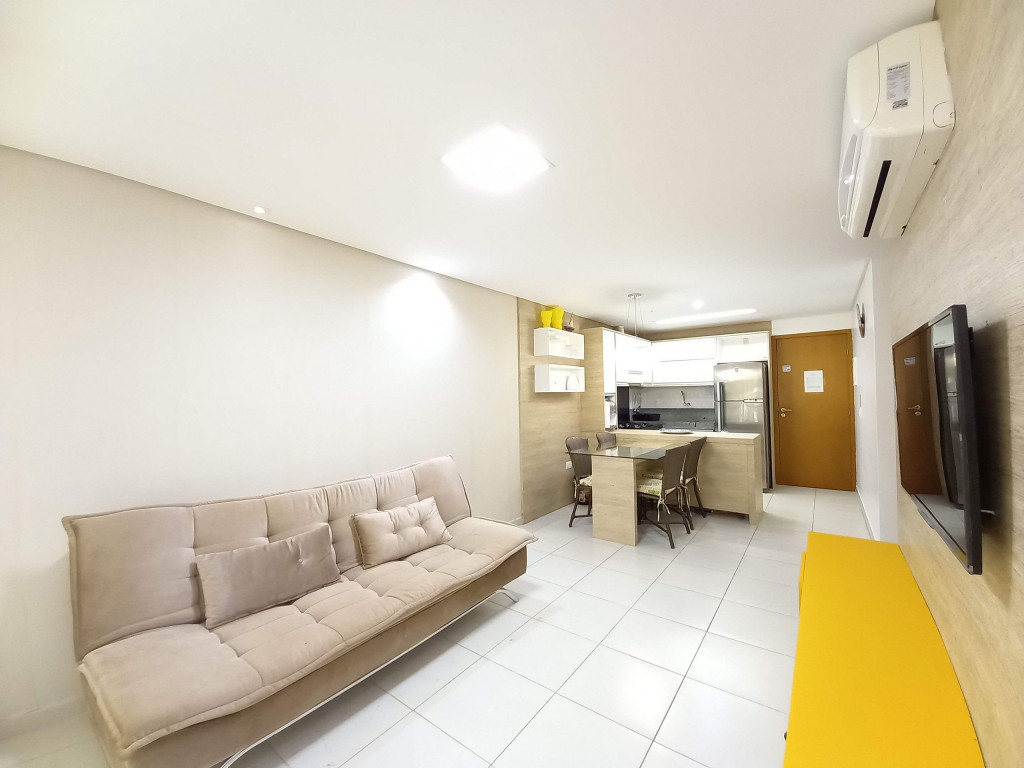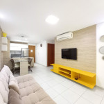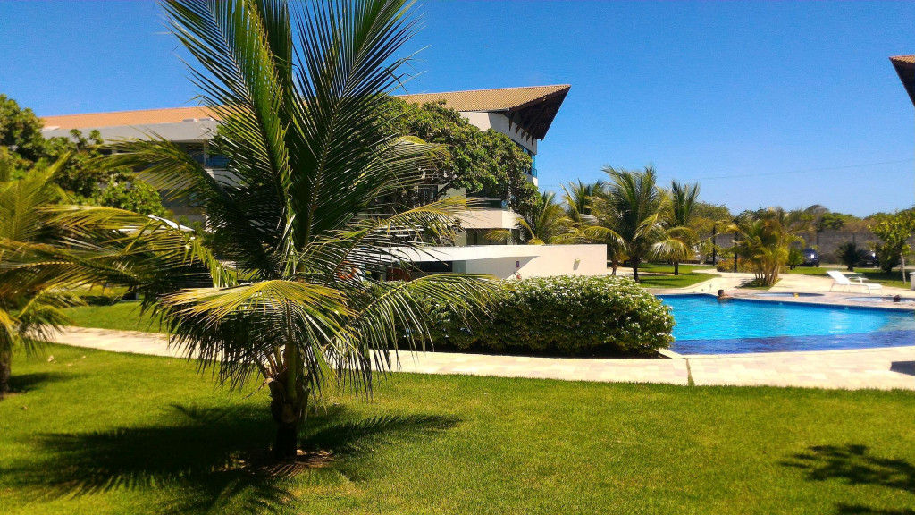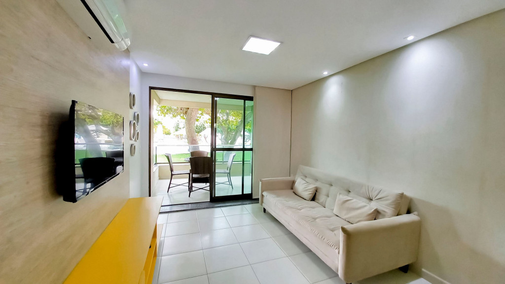 O flat se encontra no térreo do prédio com vista para a piscina e possui uma linda varanda com seis cadeiras e mesa.