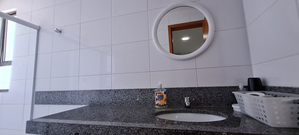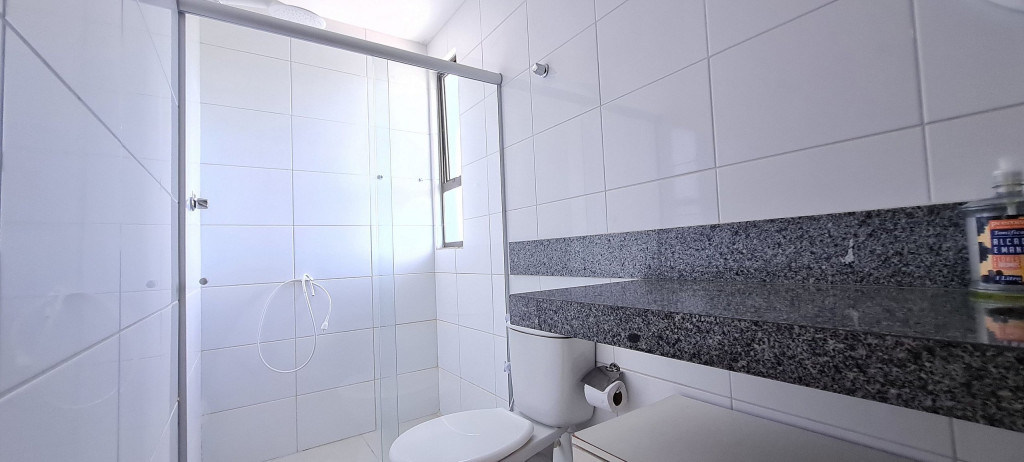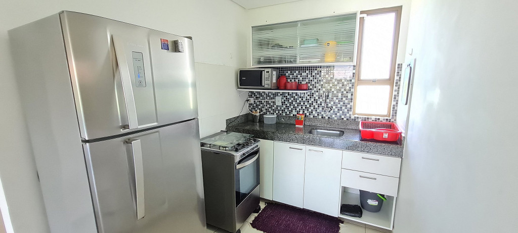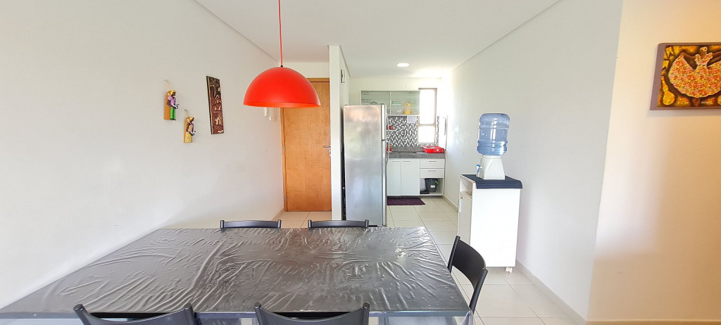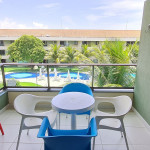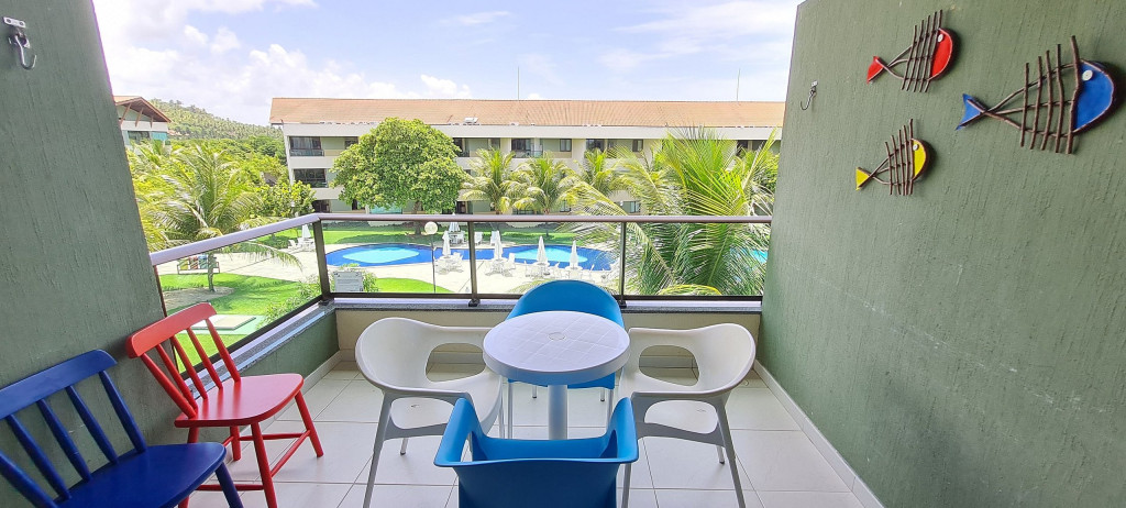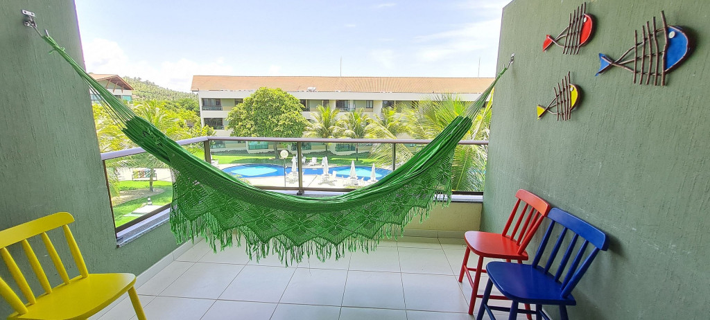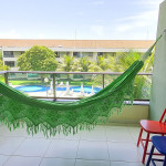 O flat se encontra no segundo andar do prédio com vista para piscina, possui também uma linda varanda com quatro cadeiras, mesa e rede.