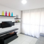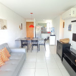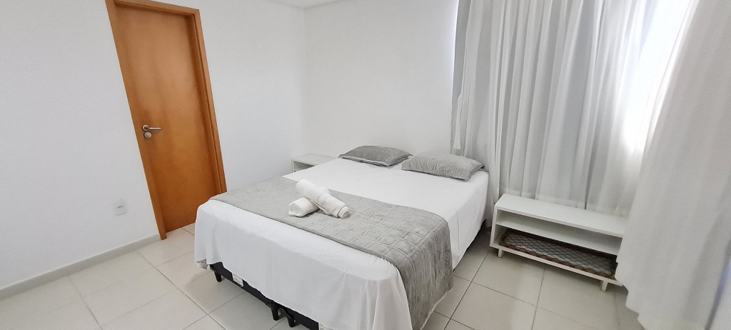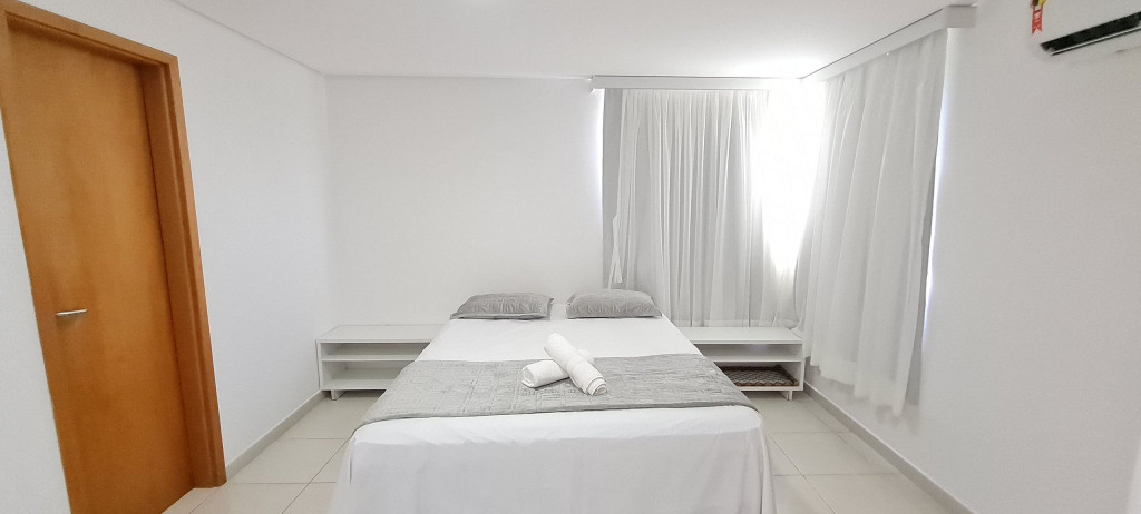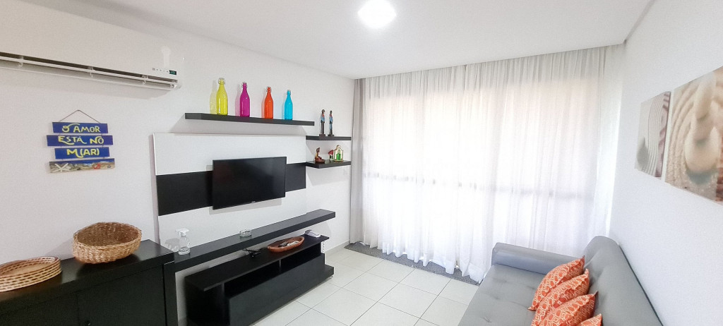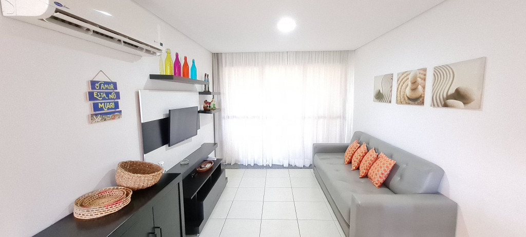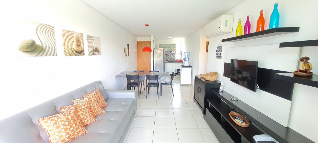 Na sala de estar você encontrará uma decoração agradável, sofá cama de casal, TV e ar condicionado. A cozinha é completa e possui diversas comodidades como louça, copos, panelas, talheres, geladeira, micro-ondas, fogão de 4 bocas, suporte para garrafão de 20L, liquidificador e diversos utensílios, além de sala de jantar com mesa e 4 cadeiras. O flat possui 02 banheiros completos (box, armário, ducha higiênica, chuveiro elétrico).