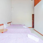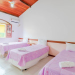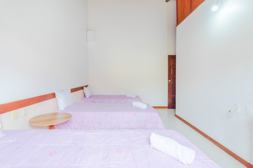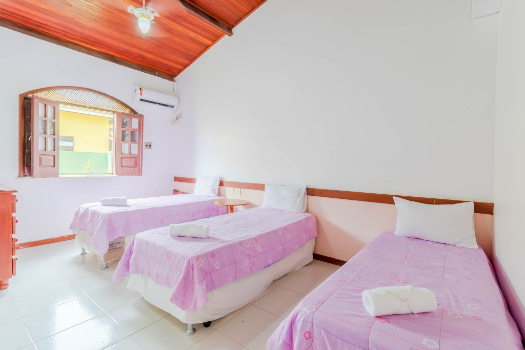 Suíte 1 (térreo): 1 cama queen, ar condicionado split, ventilador e armário;Suíte 2 (térreo): 1 cama casal e ar condicionado split;Suíte 3 (térreo): 3 camas solteiro, ar condicionado split e ventilador;Suíte 4 (superior - externo): 2 camas solteiro, ar condicionado split, armário, cortina blackout, tv + canais a cabo e varanda.