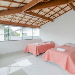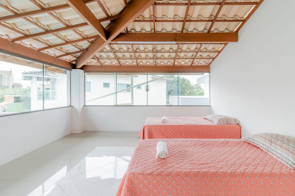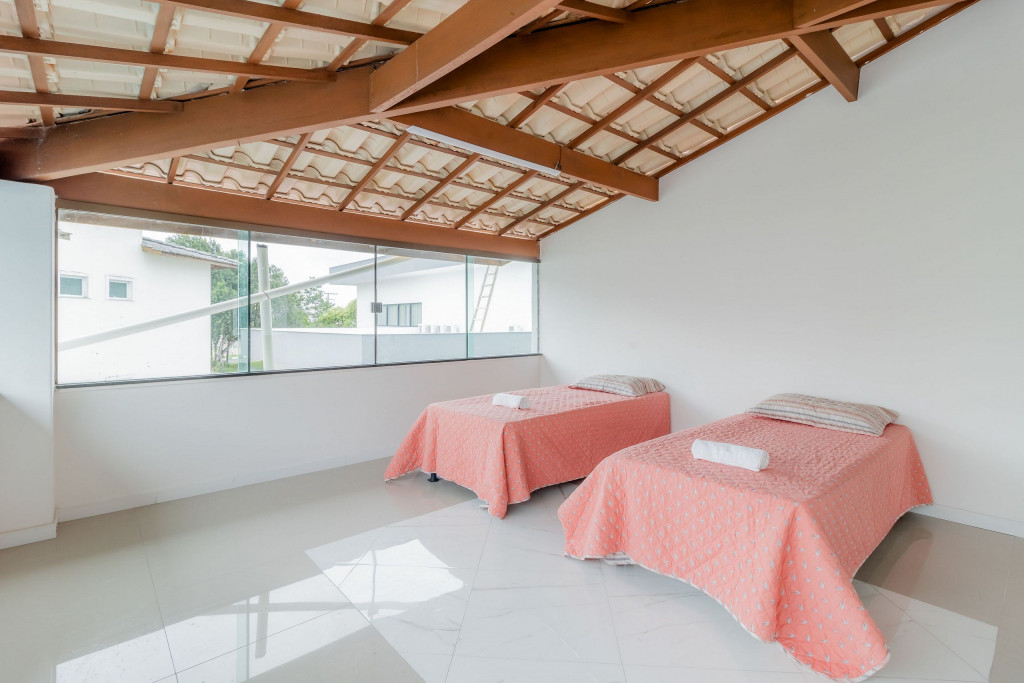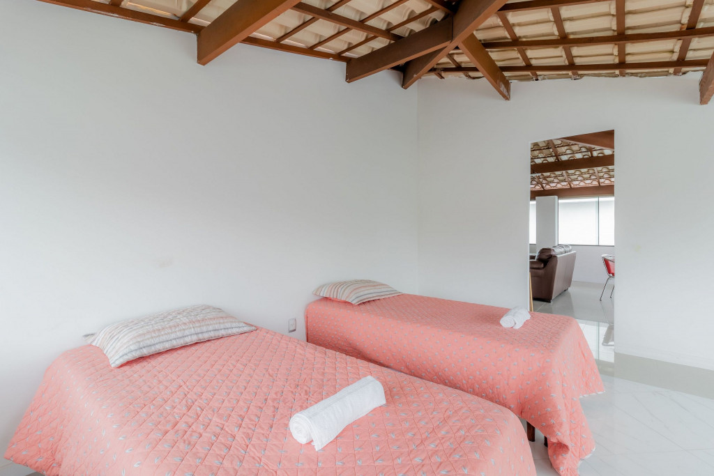A composição dos quartos é da seguinte forma:Quarto 1 (Térreo): 1 cama casal, 1 cama solteiro e armário.Quarto 2 (Superior): 2 camas solteiro, 2 colchões de solteiro.Suíte 1 (Superior): 1 cama king, Smart Tv, cortina blackout, armário e ar condicionado tipo split.Suíte 2 (Superior): 2 camas solteiro, 2 colchões de solteiro, cortina blackout e armário.Suíte 3 (Superior): 1 cama queen, Smart Tv, ventilador, cortina blackout, armário e ar condicionado tipo split.