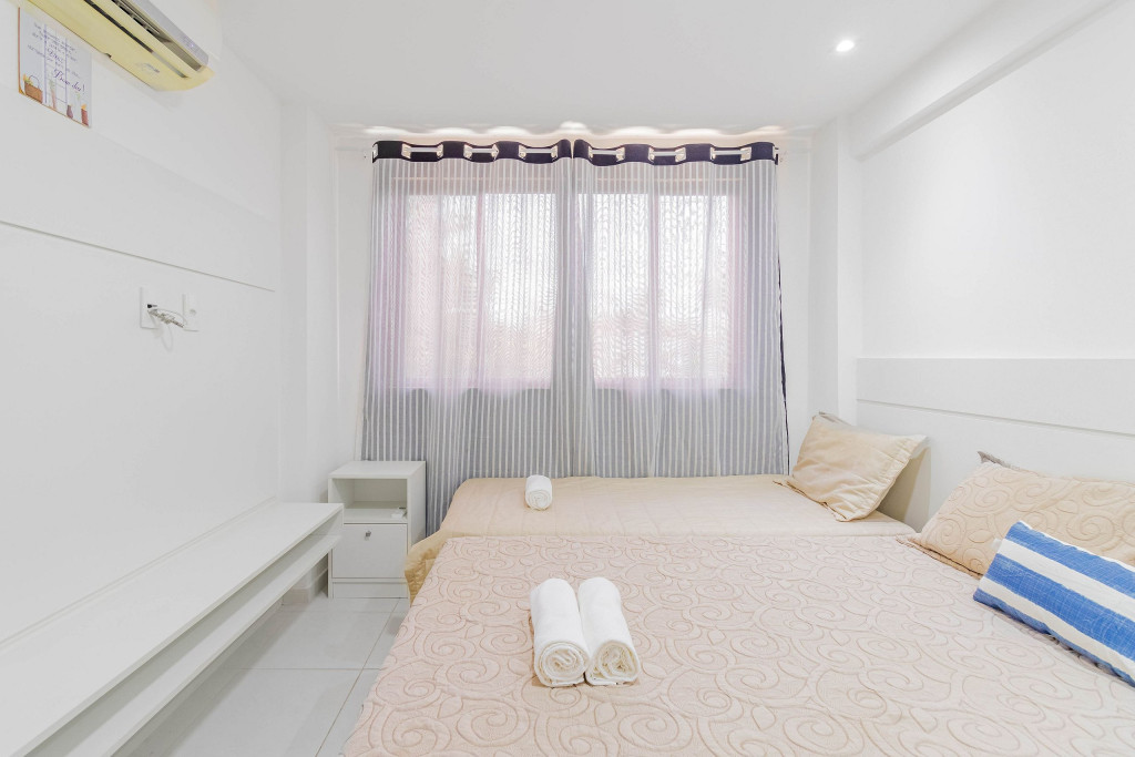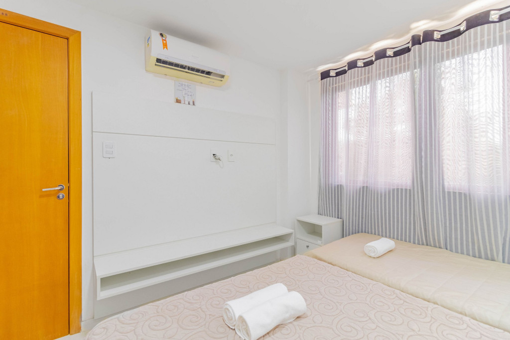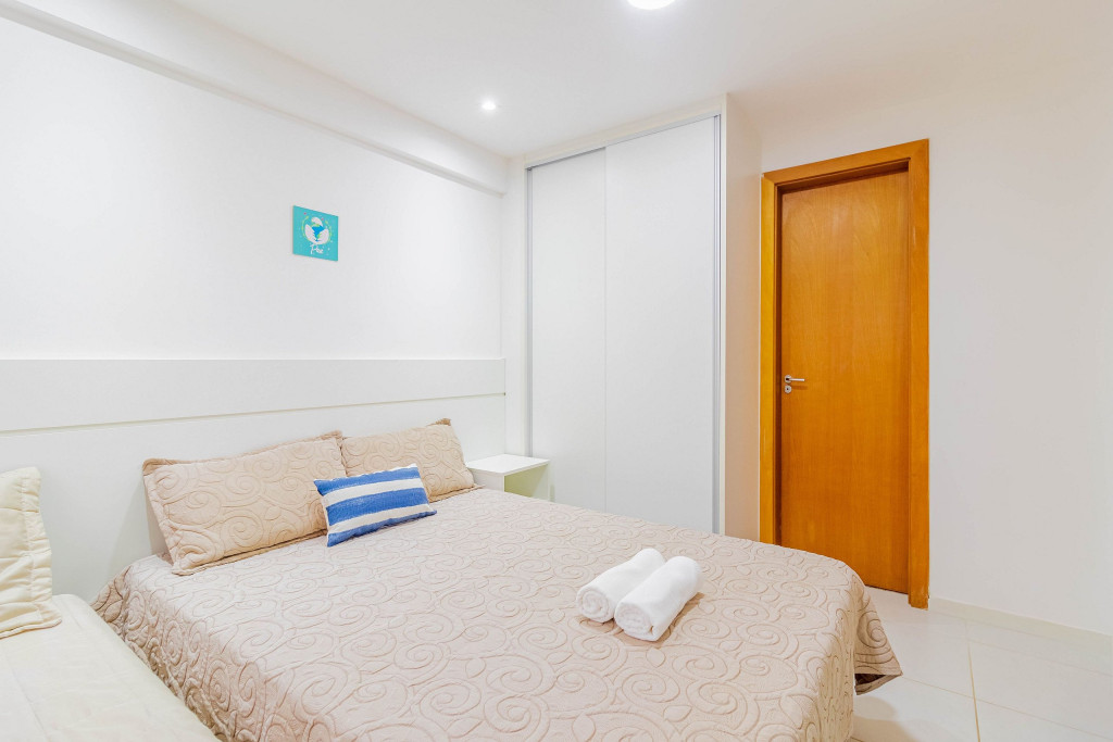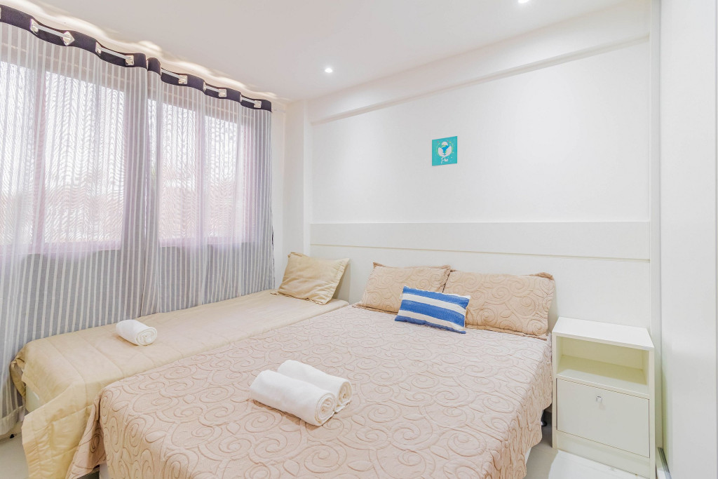 A composição dos quartos é da seguinte forma:Quarto: 1 cama casal, 1 cama solteiro, ar condicionado split, cortina blackout e armário.OBS.: Na sala de estar possui 1 sofá-cama e 1 bicama.