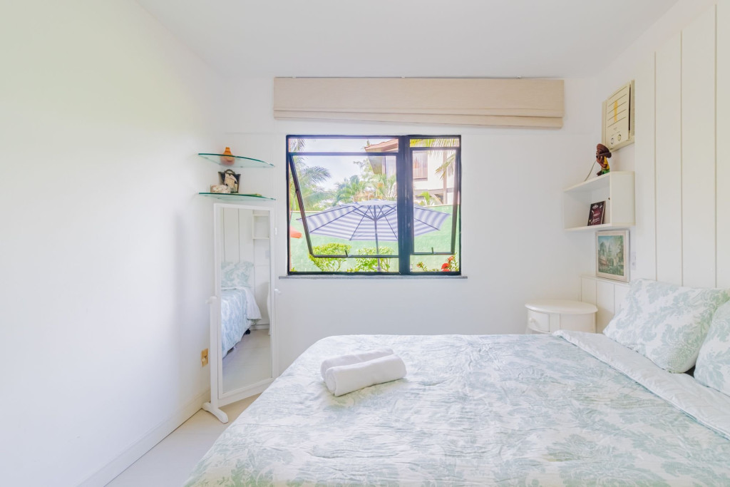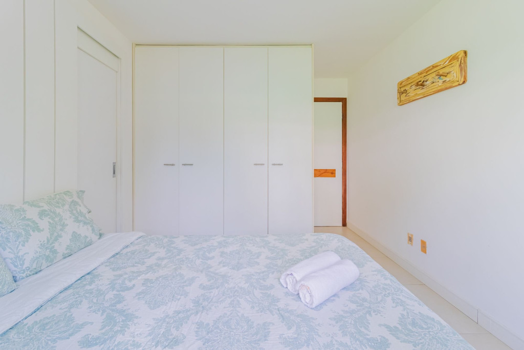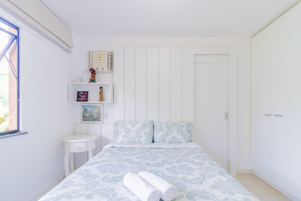 A composição dos quartos é da seguinte forma:Suíte 1: 1 cama casal, ar condicionado tipo janela, cortina blackout e armário;