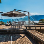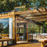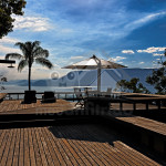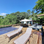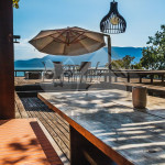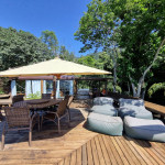 Ao sair pela porta ao lado da cozinha, é possível acessar o deck principal com churrasqueira à gás, espreguiçadeiras, puffs, chuveirão, espelho d'água (30 cm de profundidade) e mesa com ombrelone.