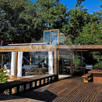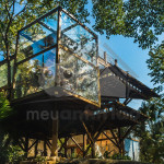 A nossa casa possui cerca de 250m2, é toda de vidro e dividida em andares, que podem ser acessados por escadas.