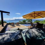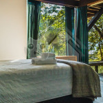 Ao chegar na casa, a partir do estacionamento, os hóspedes deverão subir alguns lances de escadas para acessar o piso térreo. Neste andar, temos 3 suítes, sendo: 1 com cama de casal e 2 com camas de solteiro, que podem se converter em de casal, caso o hóspede deseje. Todas as suítes contam com ar condicionado e araras para roupa. Além disso, 2 dessas suítes possuem varanda privativa com vista para a mata. No hall de entrada, também temos uma mesinha para home office.
