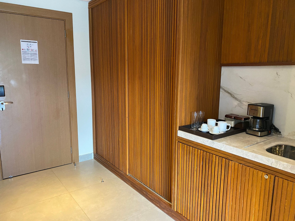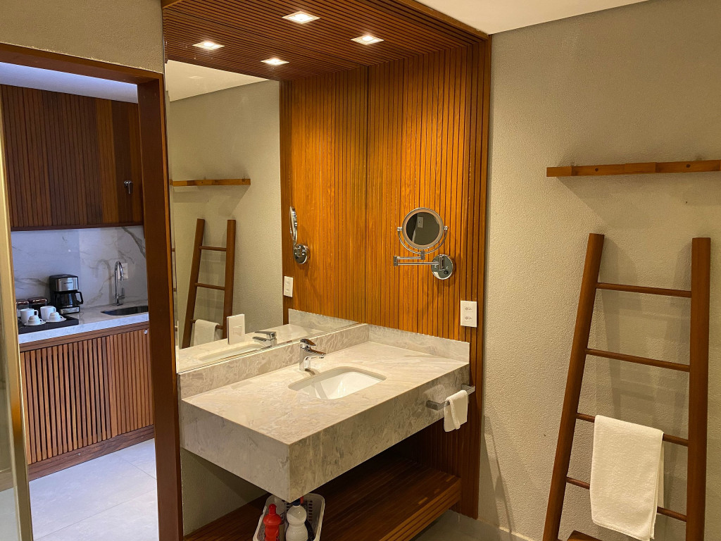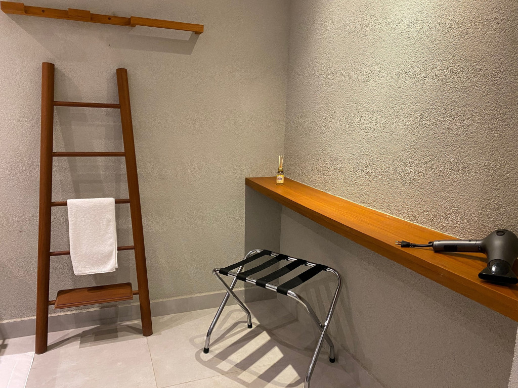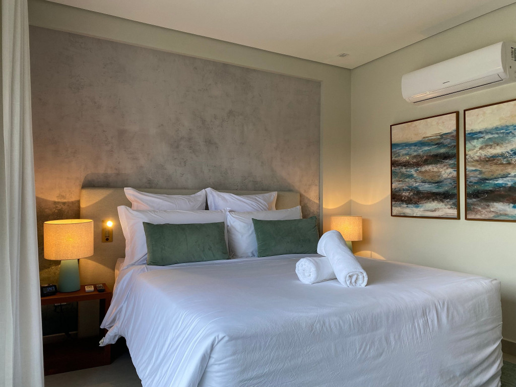 O flat está localizado no térreo, com deck molhado, enxoval premium, cama King, sofá, ar condicionado, TV, frigobar, cafeteira, itens para refeições rápidas, ducha aquecida e secador de cabelos.