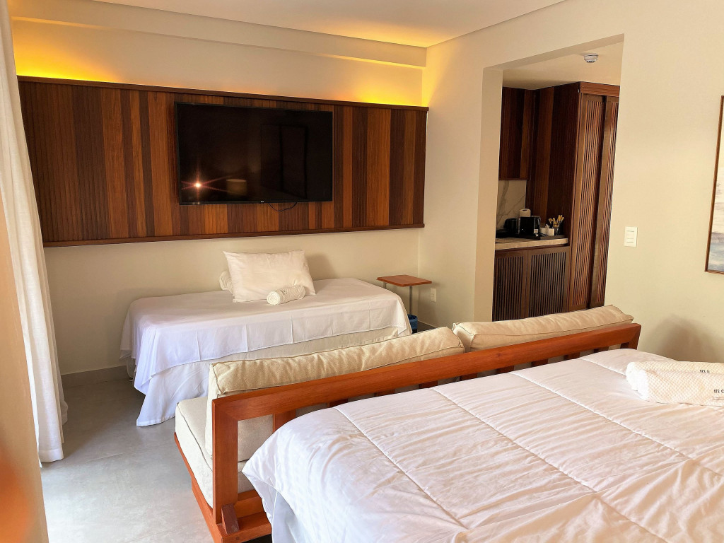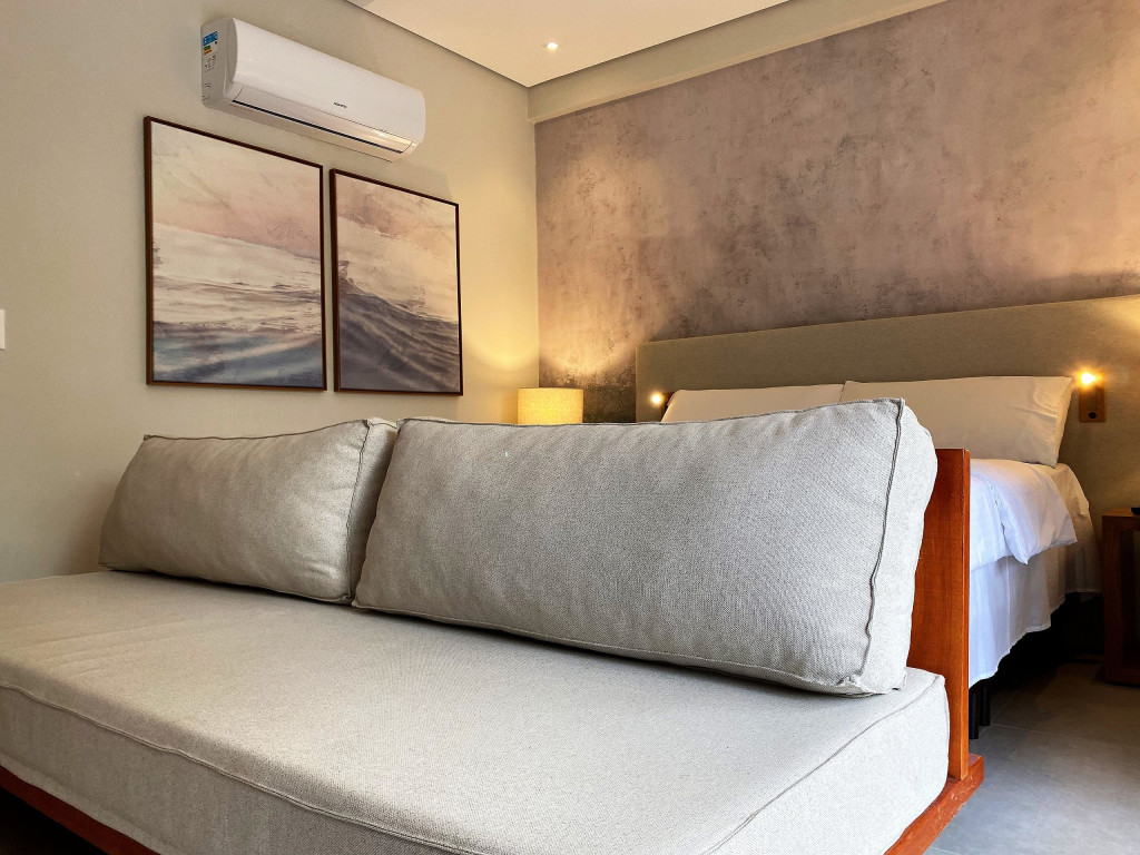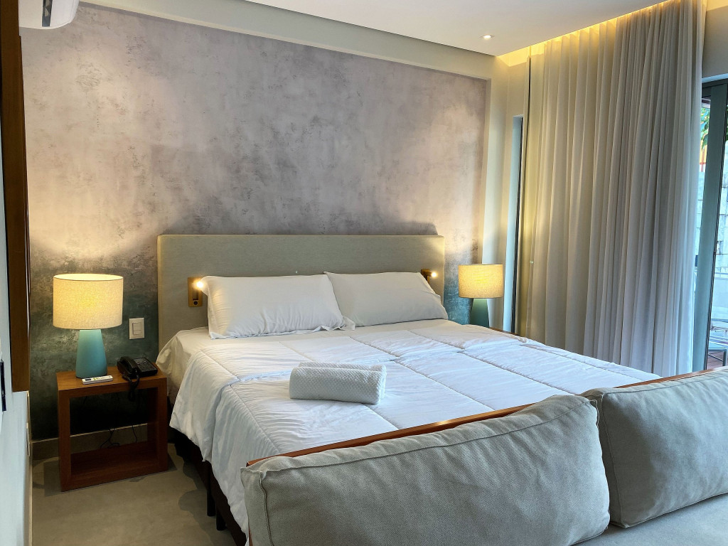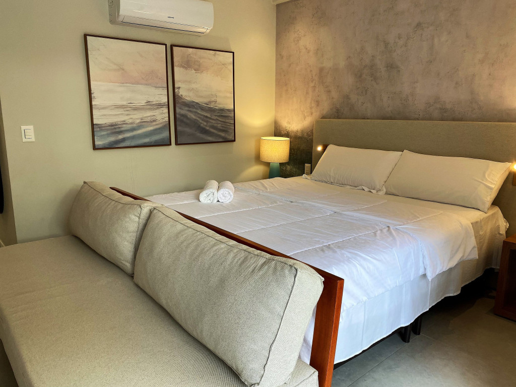O flat Creta está localizado no térreo, com deck molhado, enxoval premium, cama King + cama solteiro, sofá, TV, frigobar, cafeteira, itens para refeições rápidas, ducha aquecida e secador de cabelos.