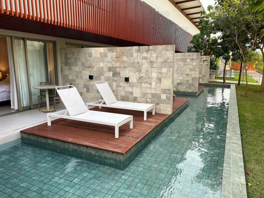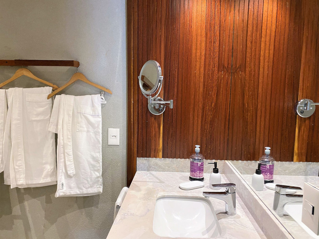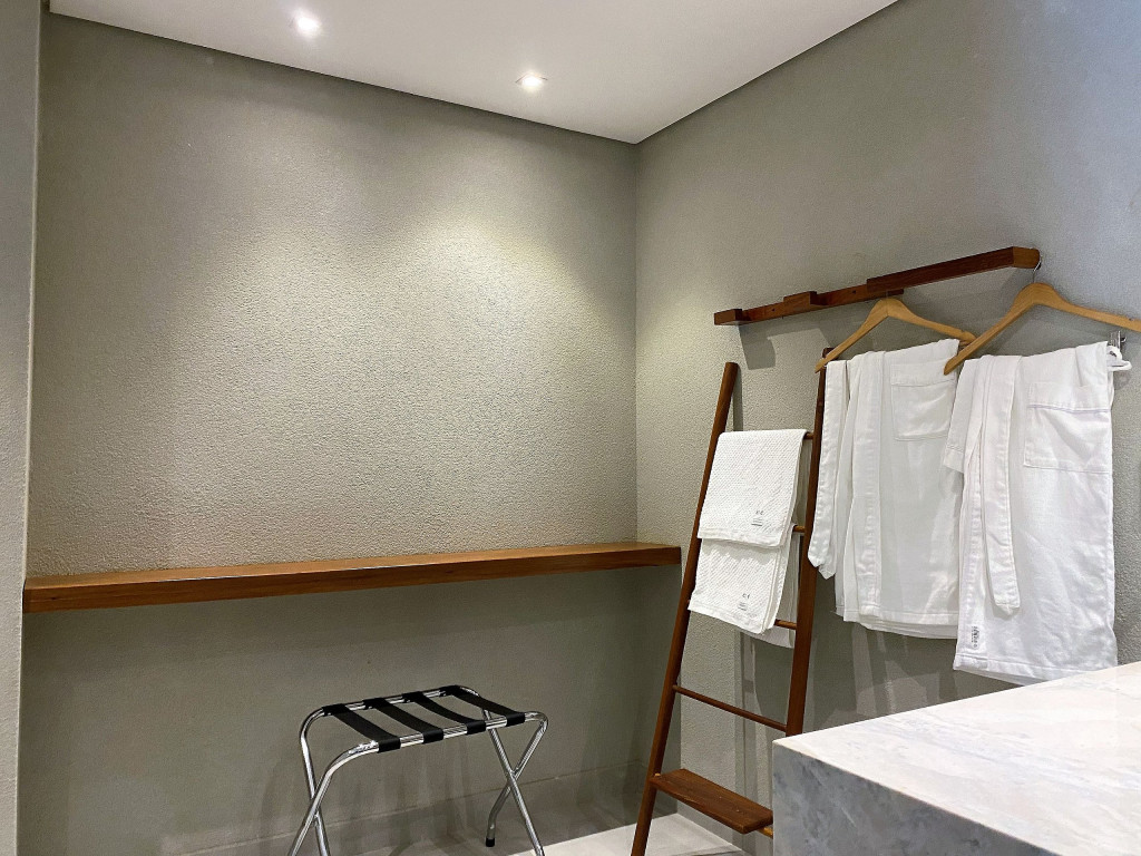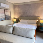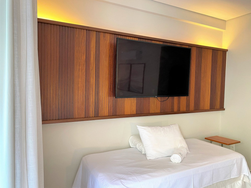 O flat Creta está localizado no térreo, com deck molhado, enxoval premium, cama King + cama solteiro, sofá, TV, frigobar, cafeteira, itens para refeições rápidas, ducha aquecida e secador de cabelos.