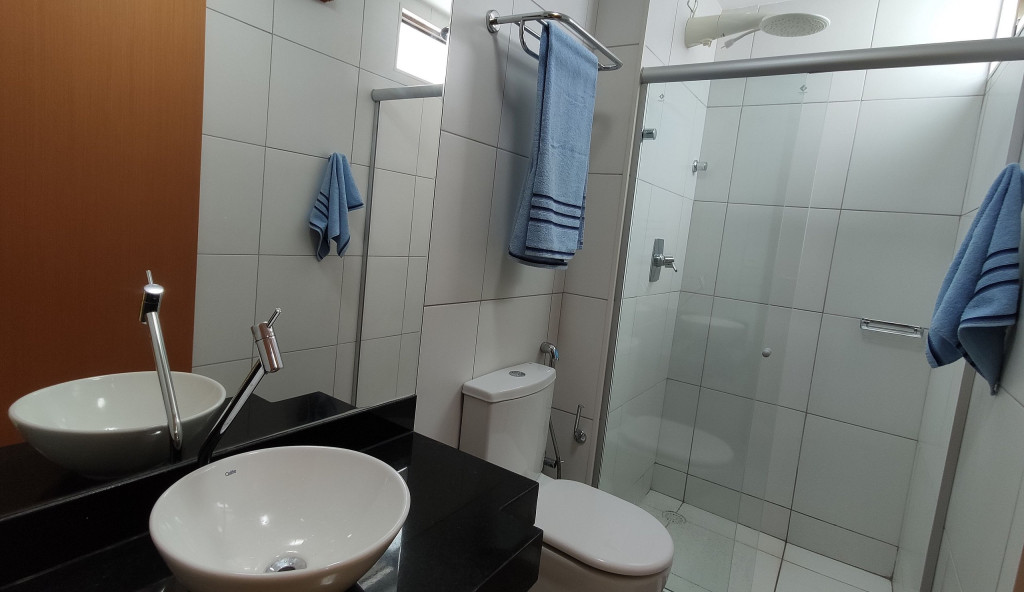 Apartamento com sala, cozinha, varanda e duas suítes sendo uma reversível.Suíte principal com cama Queen e Ar Condicionado.Suíte reversível com Ar Condicionado.Sala com sofá-cama, TV e uma agradável varanda para relaxar.Cozinha equipada com Geladeira, micro-ondas, fogão, liquidificador, sanduicheira, panelas, louças, talheres, etc.Disponibilizamos roupas de cama/toalhas e WI-FI.O prédio conta com elevador.