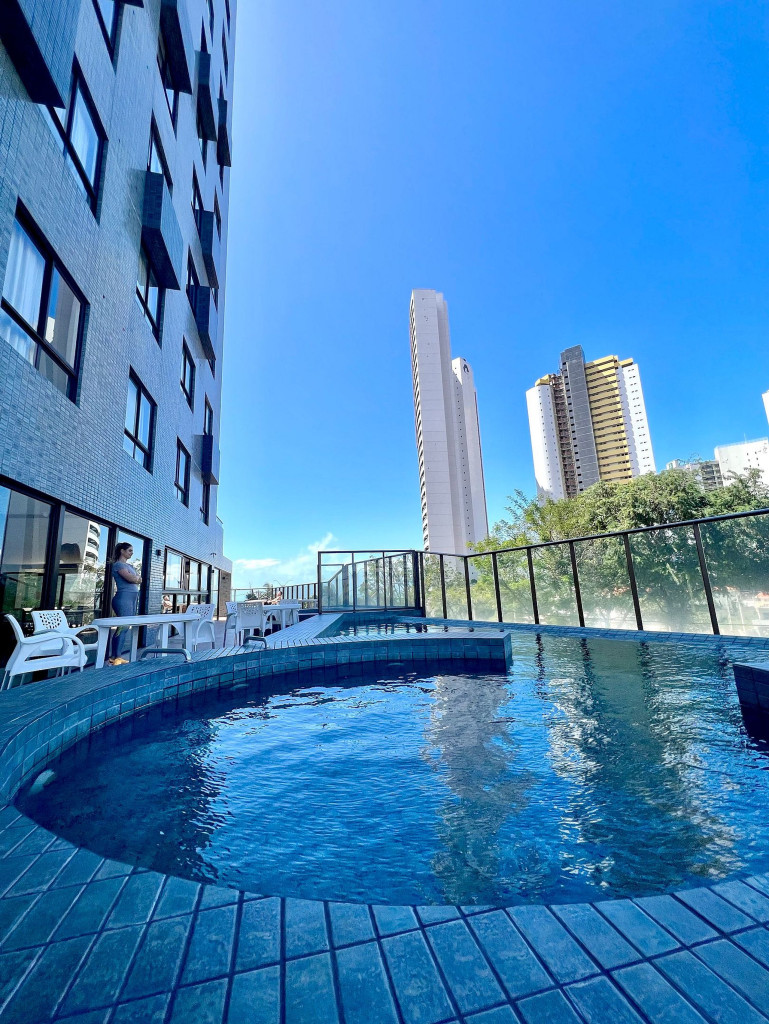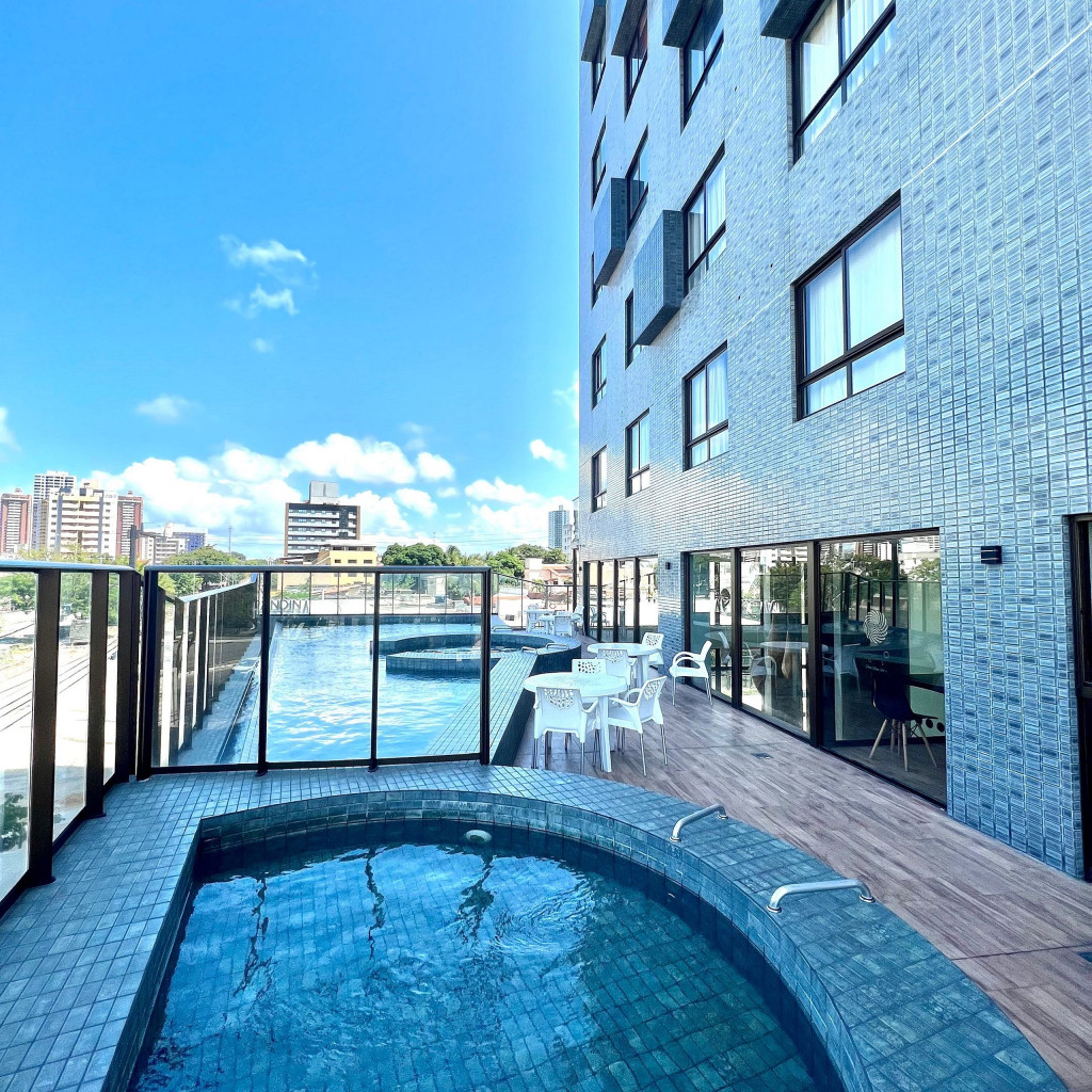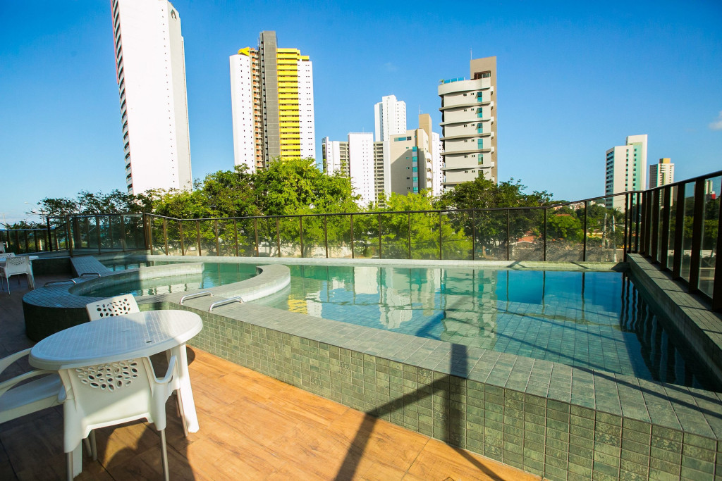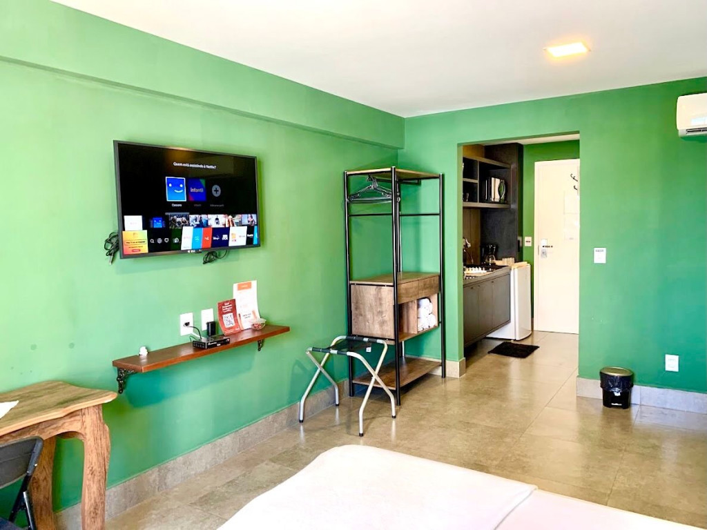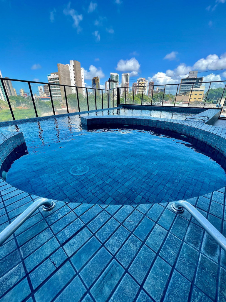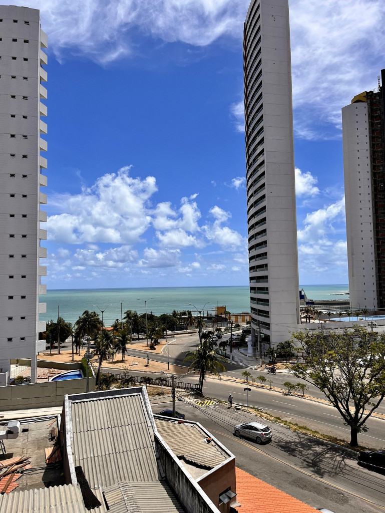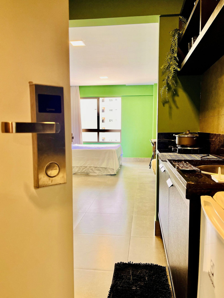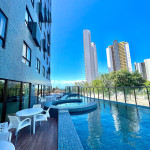 Flat moderno em Ponta Negra, com piscinas, estacionamento e recepção 24h. Quarto com cama Queen e sofá-cama, lençóis, toalhas, ar-condicionado, Smart TV e Wi-Fi. Cozinha completa: frigobar, micro-ondas, liquidificador, cafeteira, fogão (2 bocas) e utensílios. Próximo a pontos turísticos.
