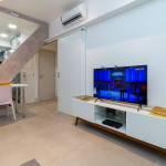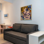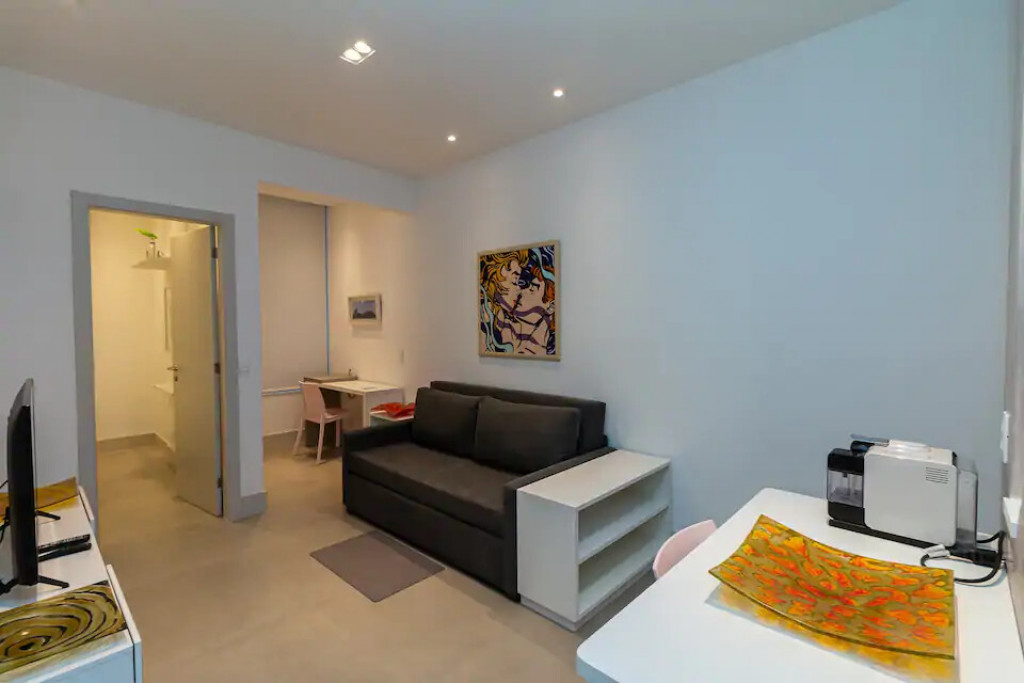 - The living room has a double sofa bed, a work station, ethernet cable, dining table and Nespresso.